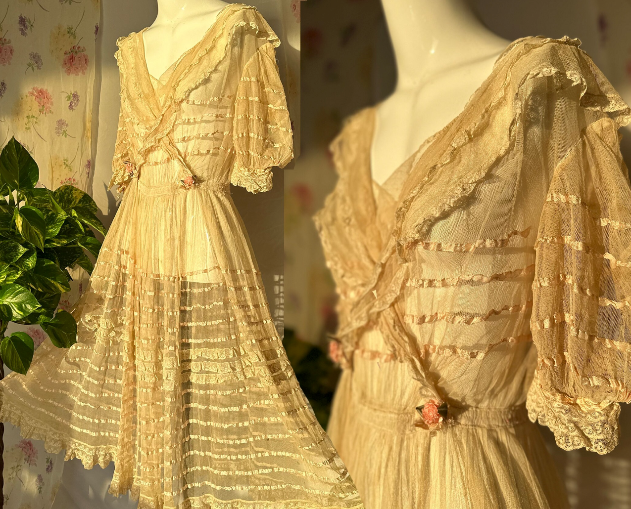 Rare Antique 1900's Peach Edwardian Sheer Netted, Ruffled, Ribboned, and Lace Party Dress. Absolutely magnificent, and hard to let go of! Beautifully romantic to the elbow Poet Sleeves with Peach Stain Lace and Peach Roses at the outside bottom of the sleeves. Gentle Ruffled Neckline with lace trim that Criss Cross across the breasts and end with two more gorgeous Peachy roses and green leaves. The skirt is wide and stunning also with the Peach ribbon throughout, and layers of Lace trim mid skirt and at the hemline. I did repairs at the shoulder where there were holes. There are some stains and discoloration which you can see clearly in the fifth image. They are under the waistline. I also made repairs to the back at the nape of the neck as the fabric separated by the snaps. It is intact now. All original snaps are working and intact. There are some small holes in the left sleeve. I did not try to repair them, as I felt it was too risky. This dress with its few flaws is still unbelievably beautiful and in amazing condition considering it's age.