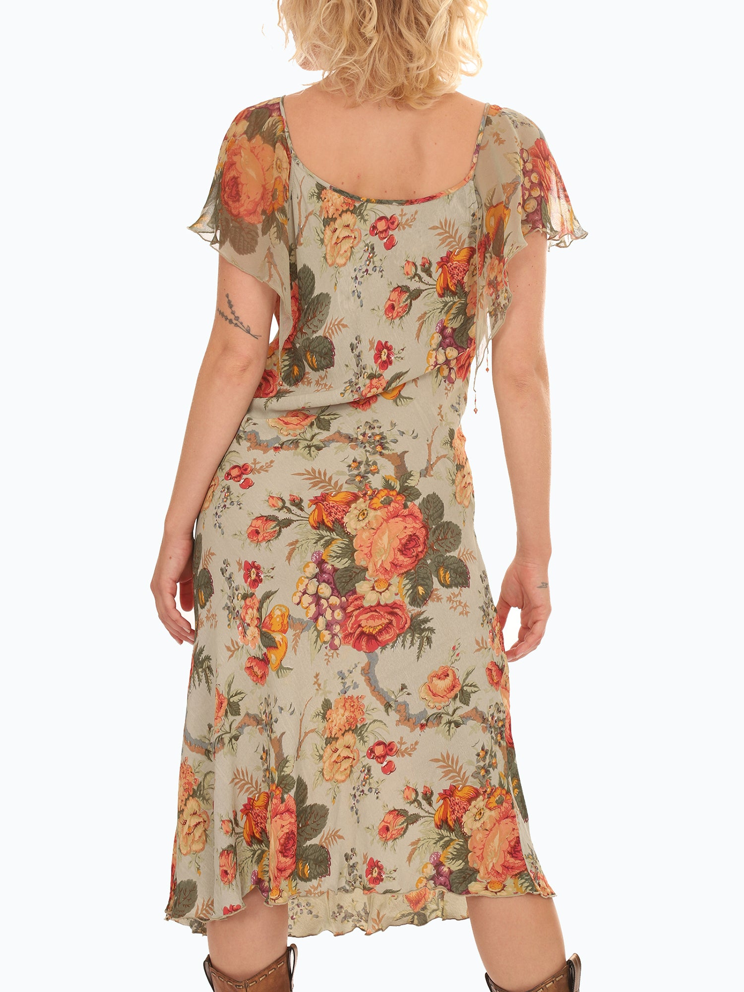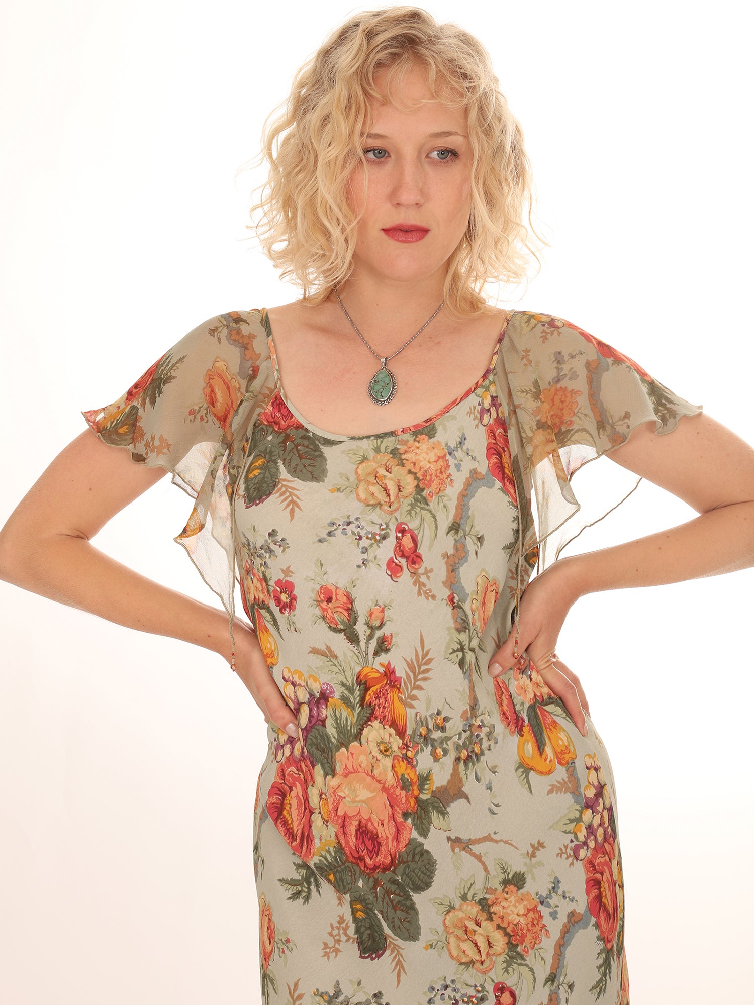 Vintage 1980s Green Rose Floral Flutter Sleeve Dress with gorgeous bouquets of Roses in shades of Orange, Yellow, and Green, with small beading and end of sleeves. Lightweight flowy Rayon fabric. Dress up with heels or with a pair of boots.