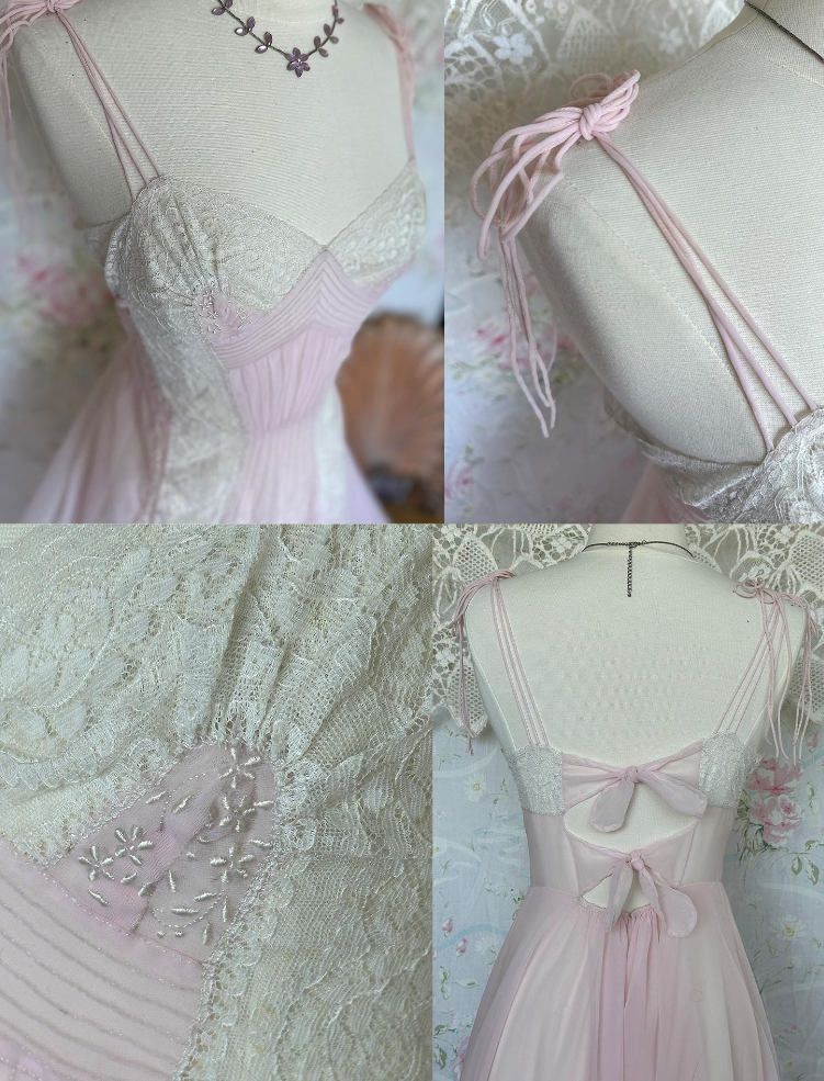 Vintage 1940s Ballet Pink Pleated Lace with Floral Embroidered flowers, triple spaghetti straps that tie at the top with fitted bodice that open up into a beautiful full sweep skirt, sweetheart lace Neckline with stunning gentle pleating to the waist, open back that ties together with two bows. There is some elastic in the back waist and a hook closure. One of the most beautiful nightgown, slips I have ever encountered. Too beautiful to keep in the bedroom really! I also show with a lace duster robe that will be sold separately. So beautiful you will want to keep it out to look at it. I have had it out in my living room for weeks!