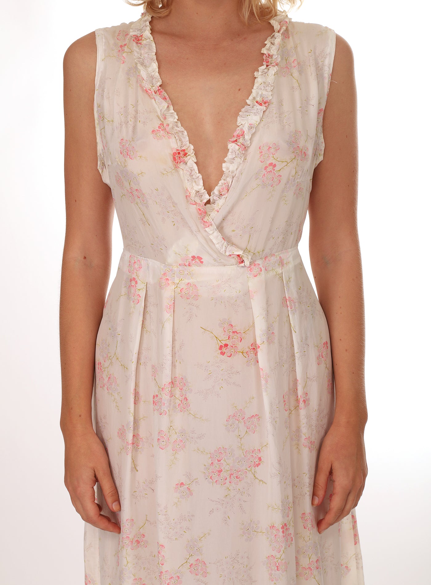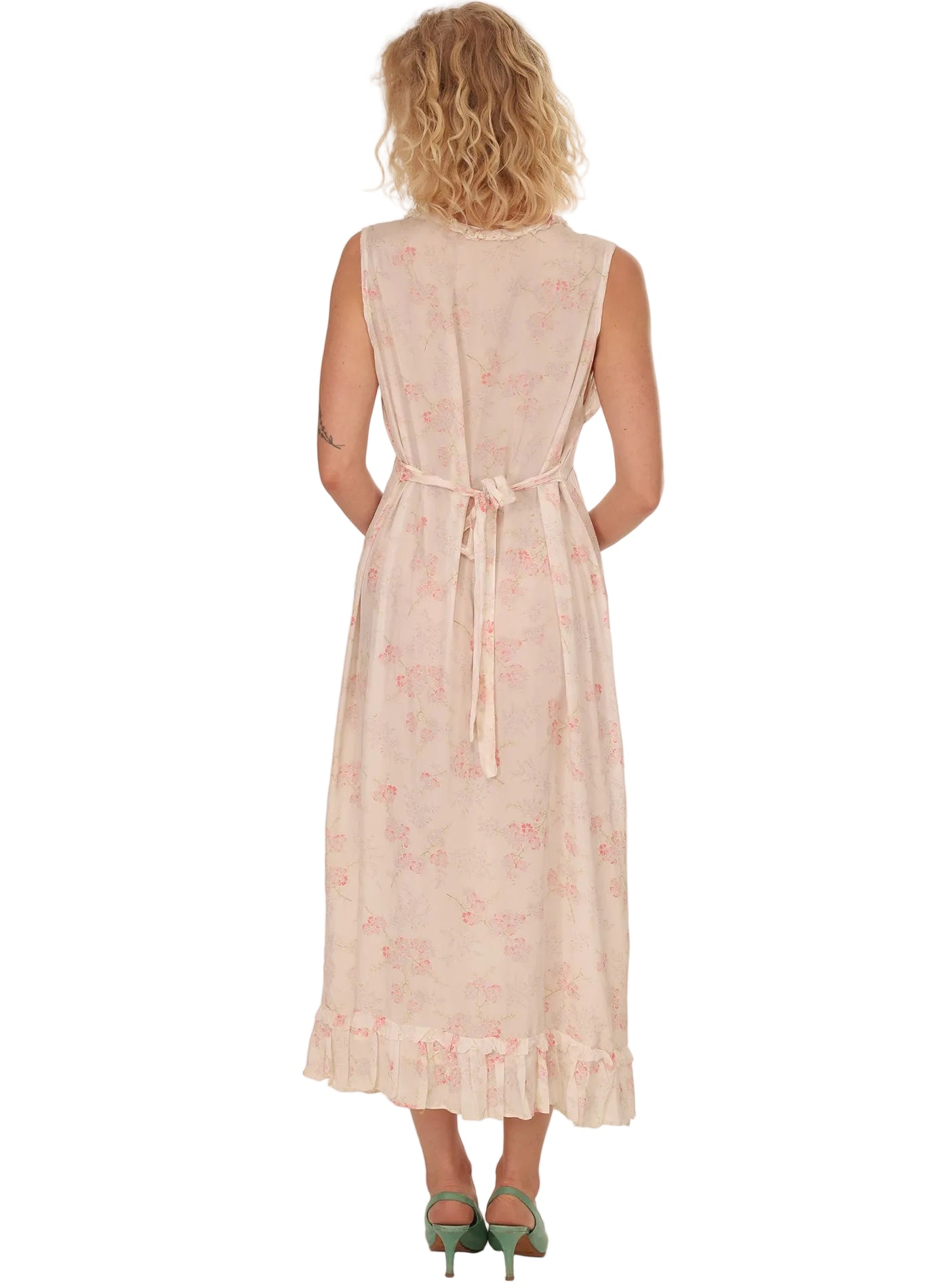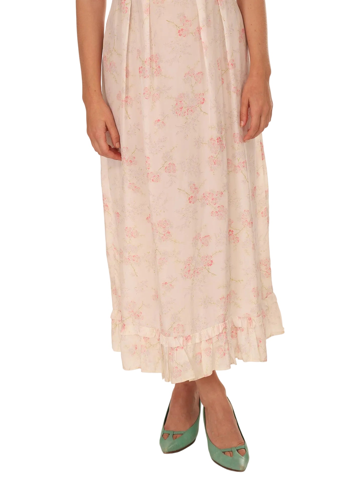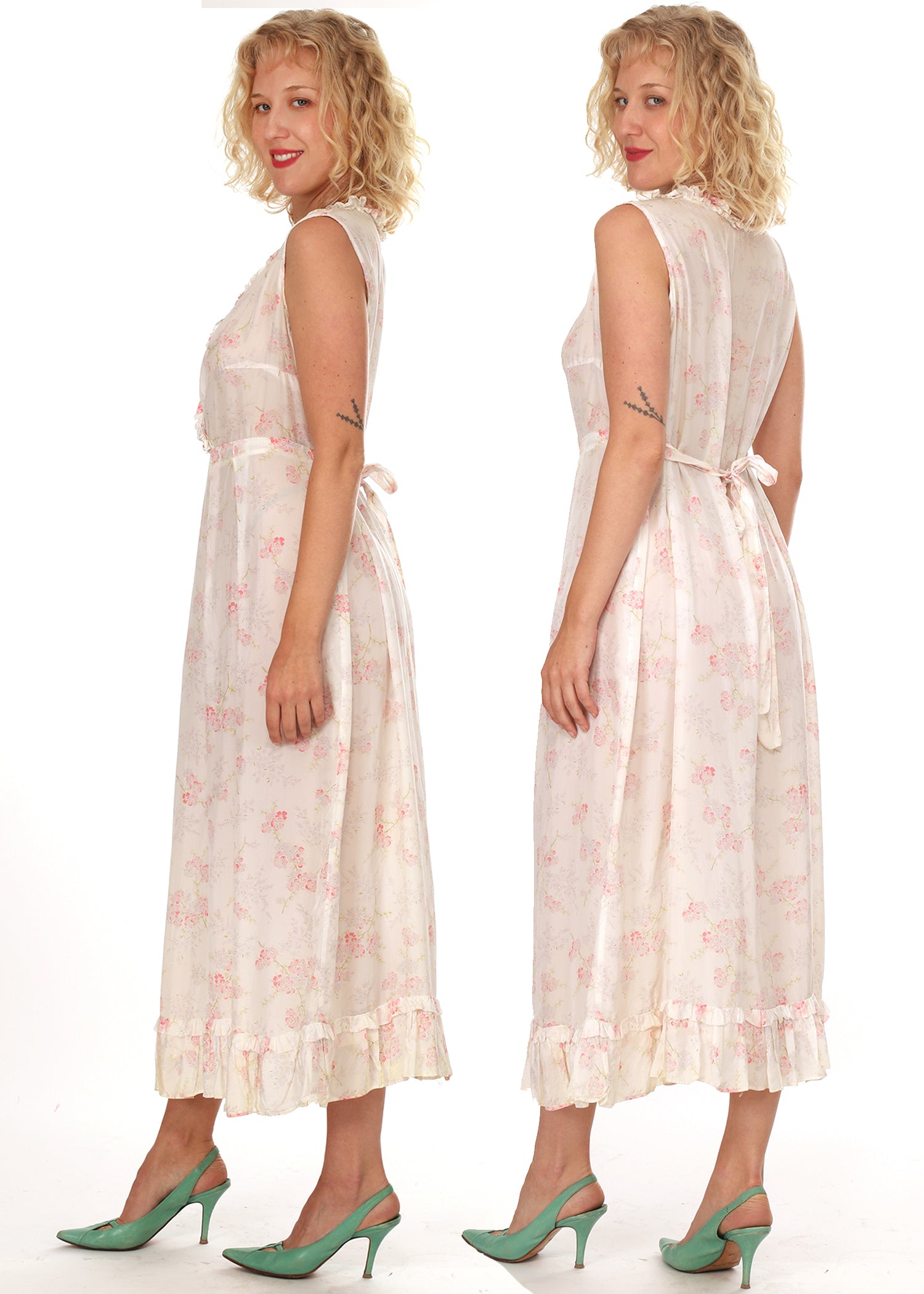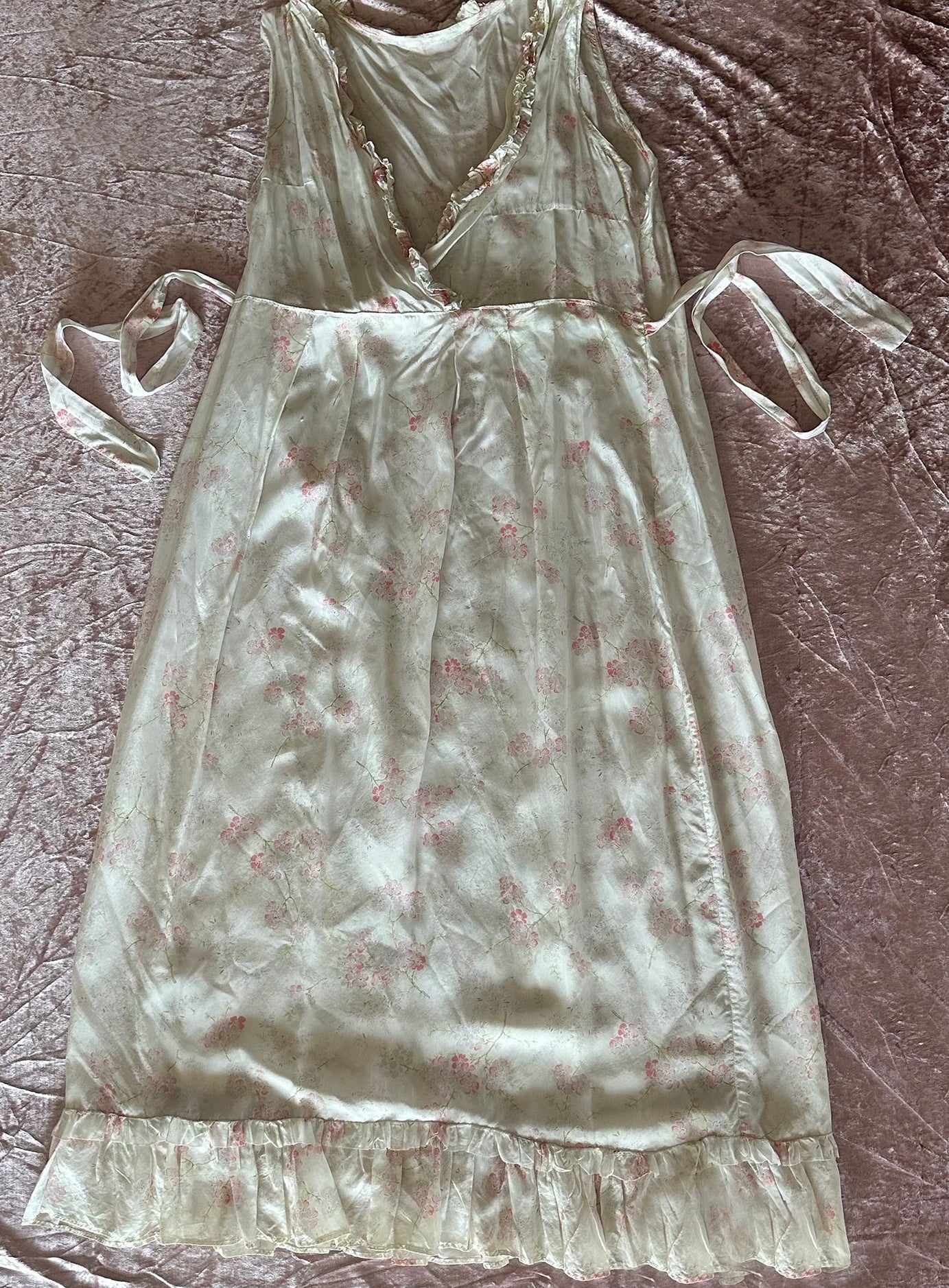 Vintage 1940s French White Floral V-Neck Ruffled Slip Dress with Ruffled Bottom with Tie Back Ribbon. In a Silky Soft Shimmery Flowy Vintage Rayon. The bouquets are so subtle and beautiful in shades of pink and minty green. It is a generous size that can be worn by different body types. Worn with the tie loosely tied or pulling it in for a smaller fit. It has gorgeous movement and so light and comfortable you will want to wear it again and again, out for the day or evening with a pair of heels, or sandals or cowboy boots, and certainly comfy enough to fall asleep in! So feminine and pretty!