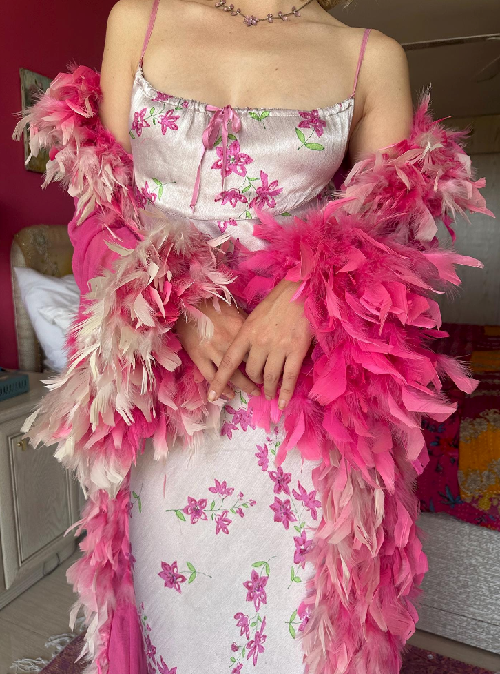 Vintage 1960s Fuchsia Pink Feather Boa Duster Robe with Feathers in Shades of Fuchsia and Light Pink with a sheer Fuchsia Robe. One size. So much fun to wear over a slinky dress, with a pair of jeans, or for a fun night in your boudoir! Slinky, sexy in the most amazing colors.