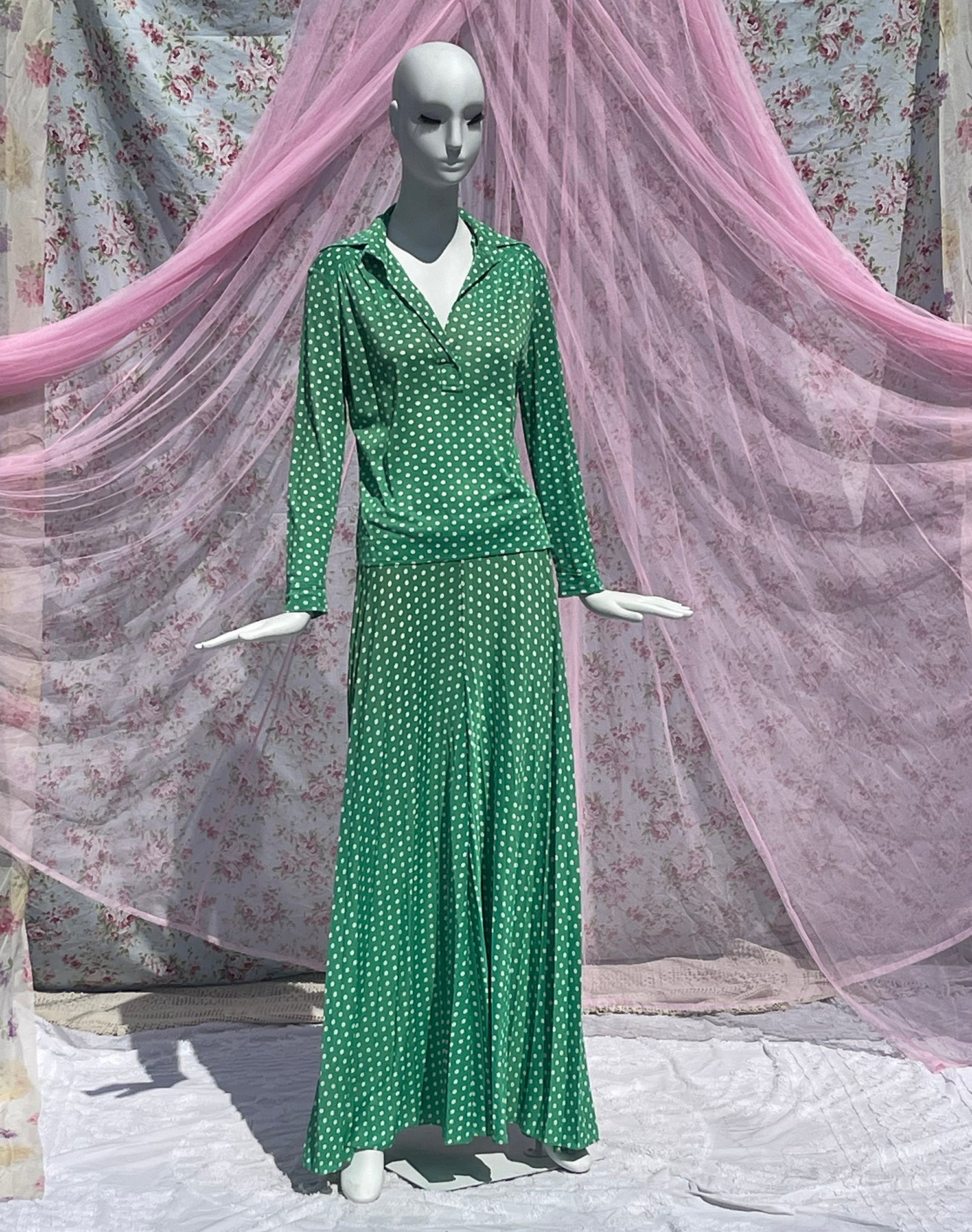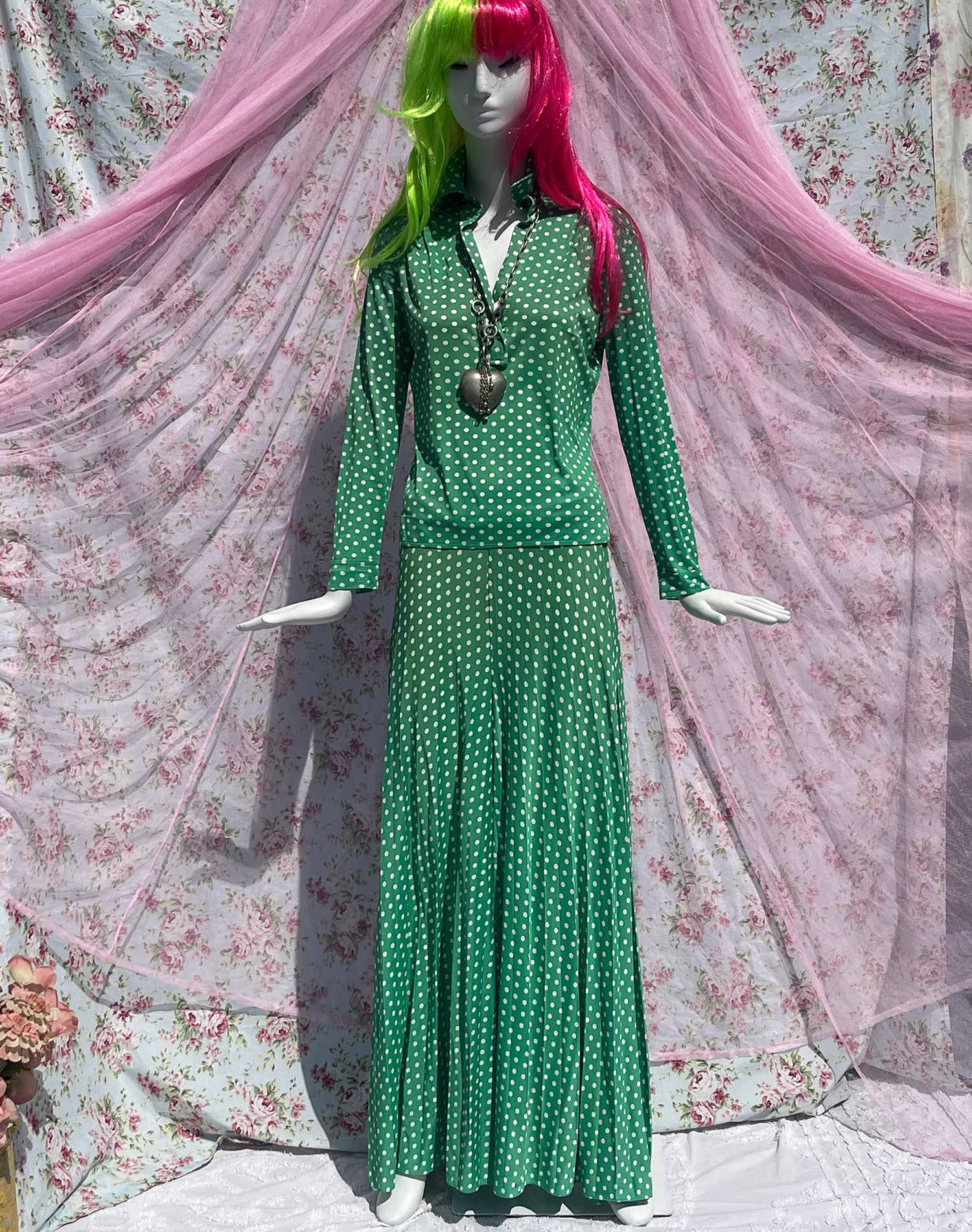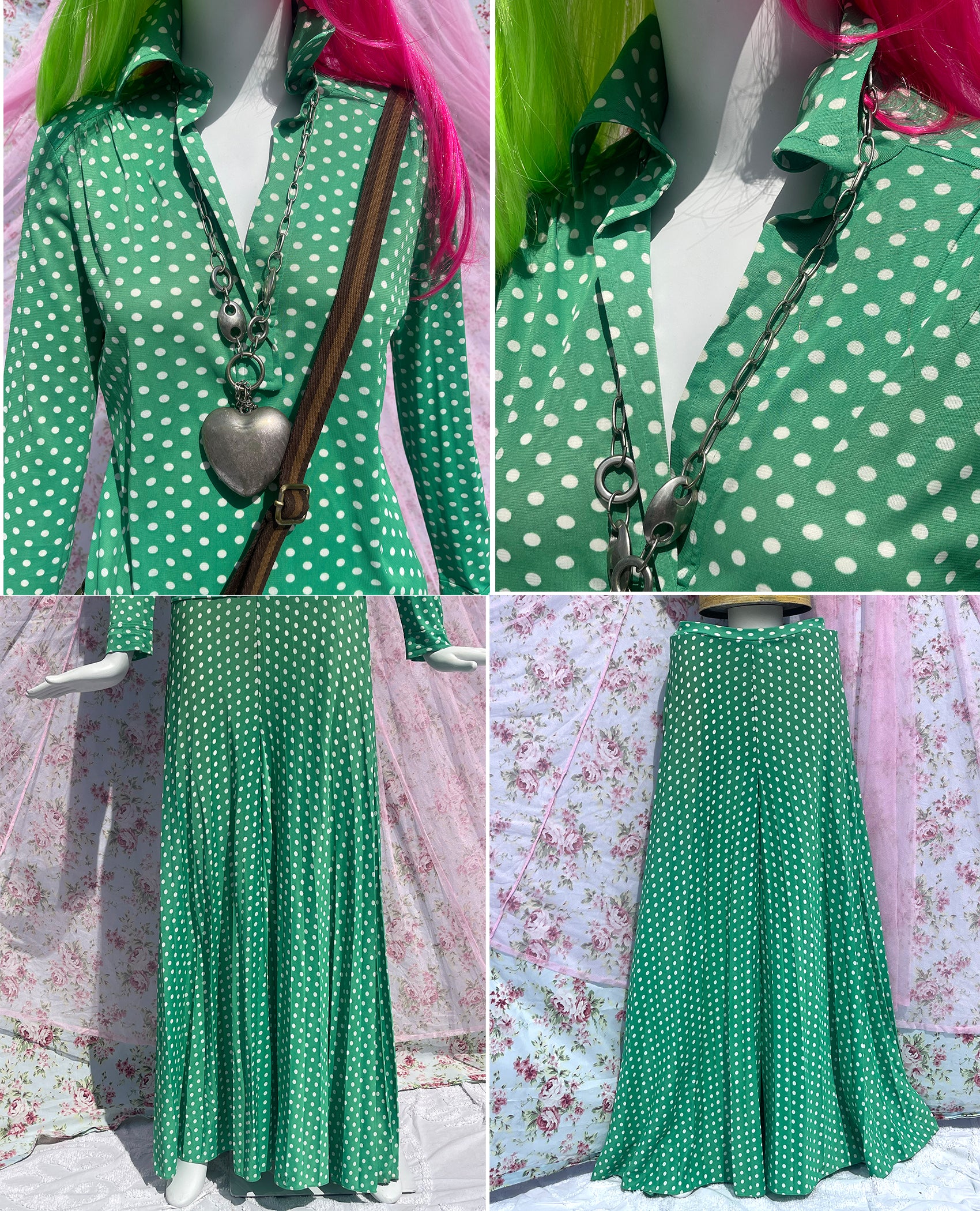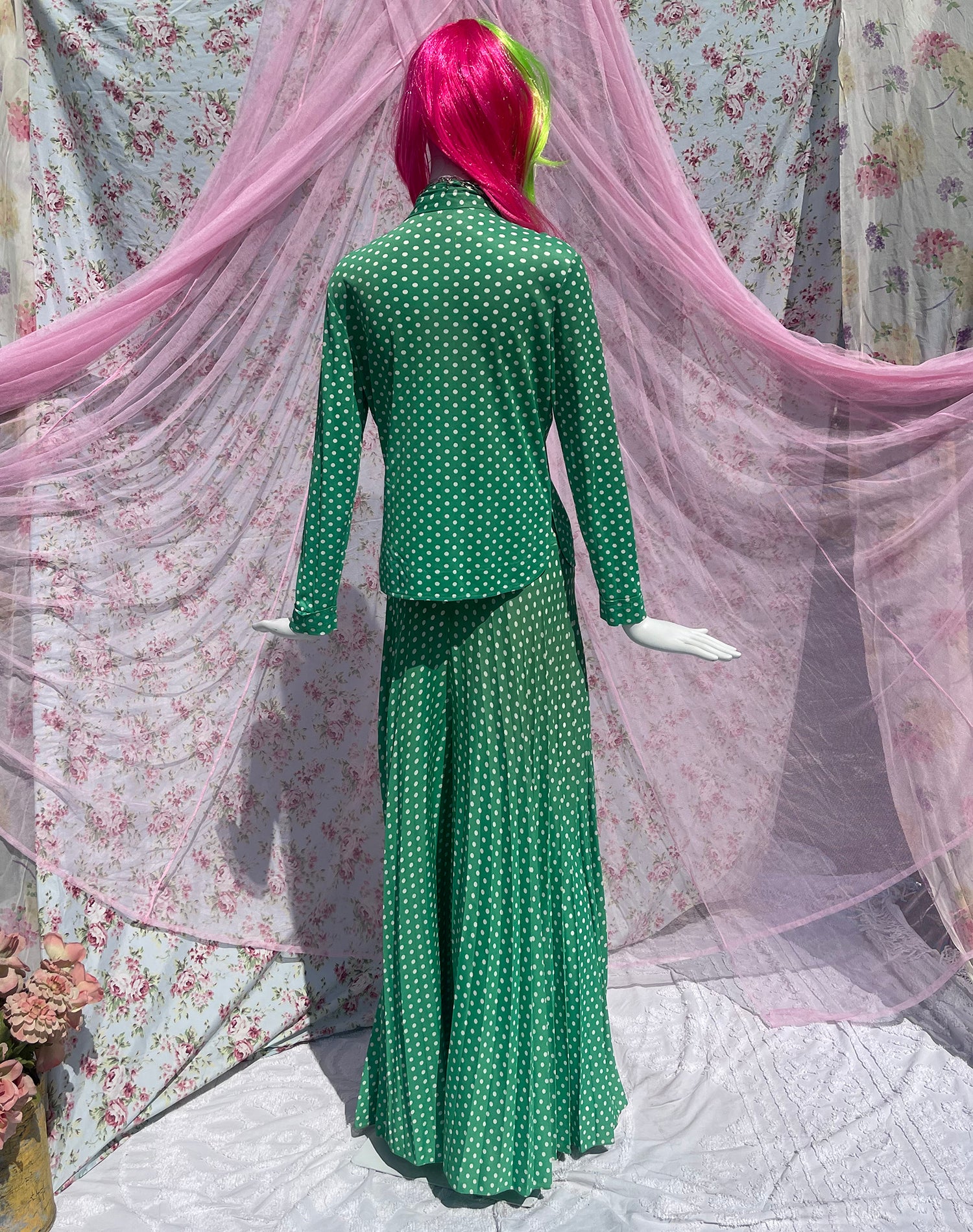 Vintage 1960s Green and White Polka Dot Blouse and Pleated Super Wide High Waisted Bell Palazzo Pants Set. Utterly kool, lightweight and fabulous. The Palazzo pants bell bottoms are so wide and wonderful, when worn falls like a Maxi Skirt. The top has a bit of an open slit at the sides and is a bit shorter in the front than the back. Of course you don't have to wear them together, and although I usually am not attracted to a matching set, this one was just so fabulous I had to get it. Now it can be yours. The waistband is elastic. This set is so easy, breezy and comfortable to wear.