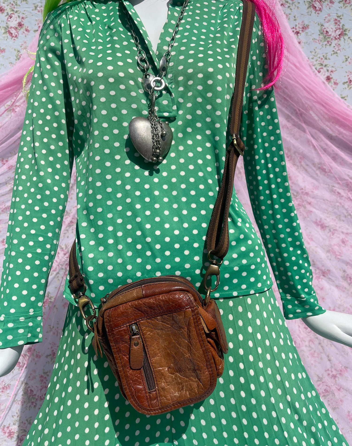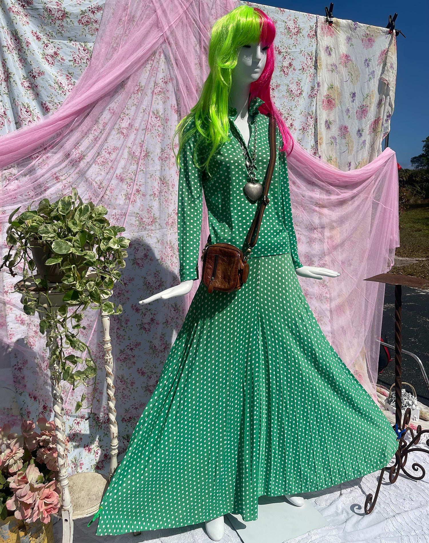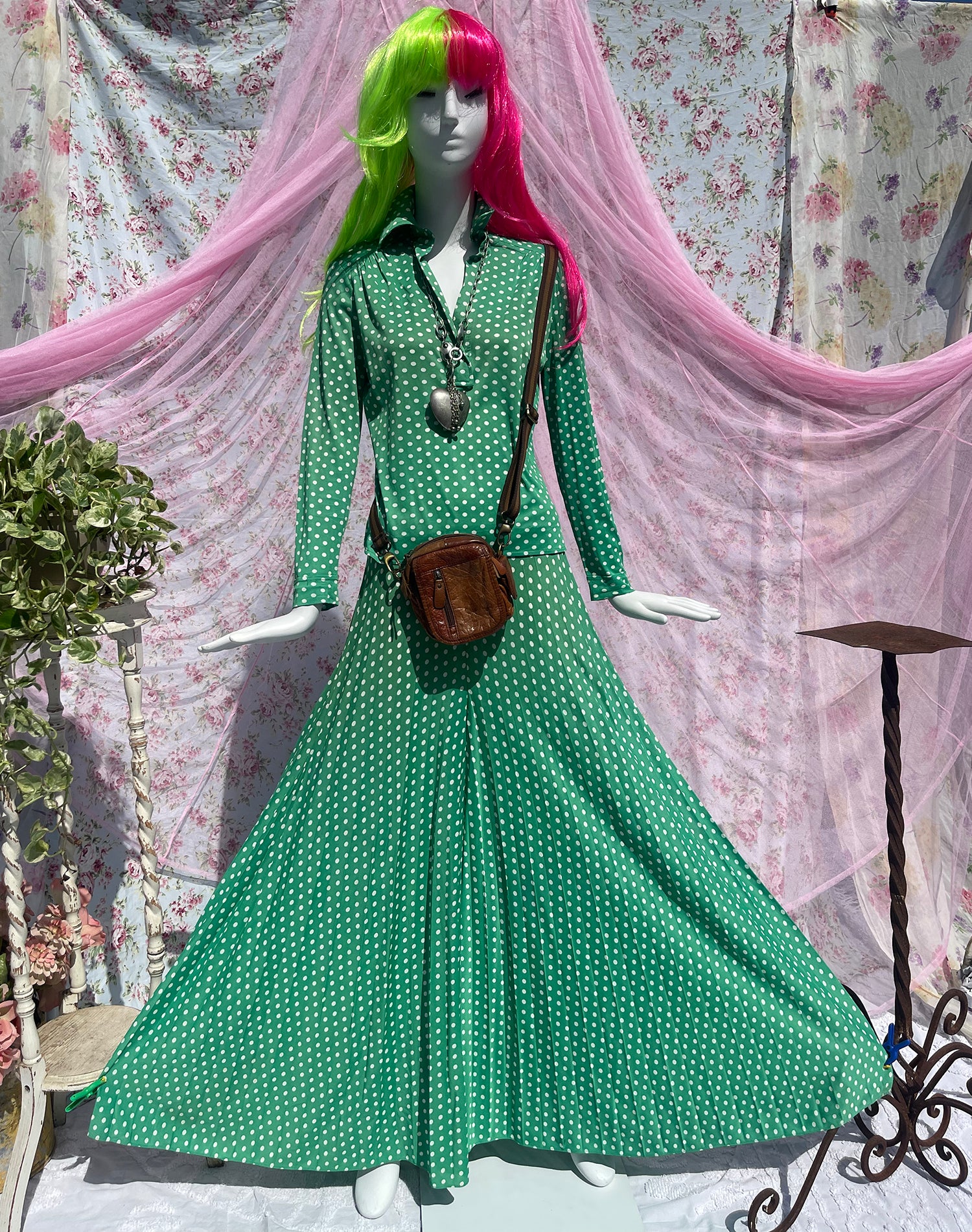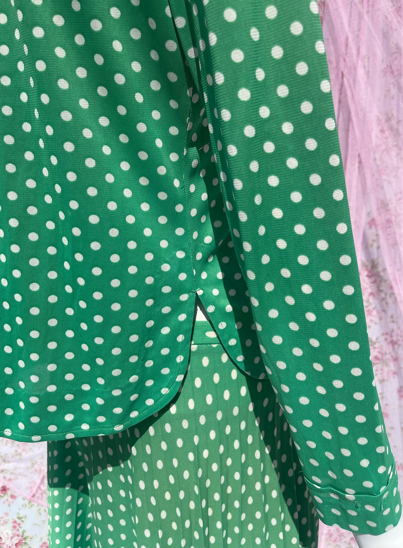 Vintage 1960s Green and White Polka Dot Blouse and Pleated Super Wide High Waisted Bell Palazzo Pants Set. Utterly kool, lightweight and fabulous. The Palazzo pants bell bottoms are so wide and wonderful, when worn falls like a Maxi Skirt. The top has a bit of an open slit at the sides and is a bit shorter in the front than the back. Of course you don't have to wear them together, and although I usually am not attracted to a matching set, this one was just so fabulous I had to get it. Now it can be yours. The waistband is elastic. This set is so easy, breezy and comfortable to wear.
