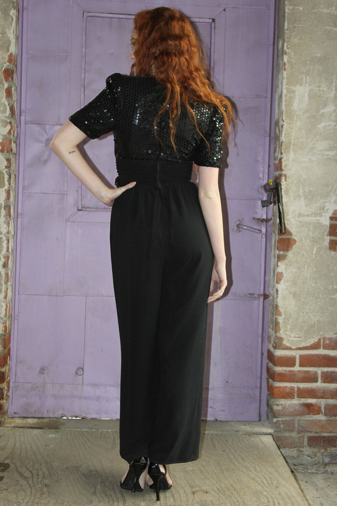 Vintage 1980s Black Sequin Cumber Bun Ruched Onesie Jumpsuit with Sequin V Neck Neckline, Sequin Floral Rose Embellishment at waist, Sheer Lined Wide Leg pants. Zips up the back. Chic and elegant and so easy to wear! Wear with a great pair of heels or high heeled boots. Throw on a great pair of earrings that sparkle a plenty and your ready for a great night out on the town or for a cocktail party! Such a great find!
