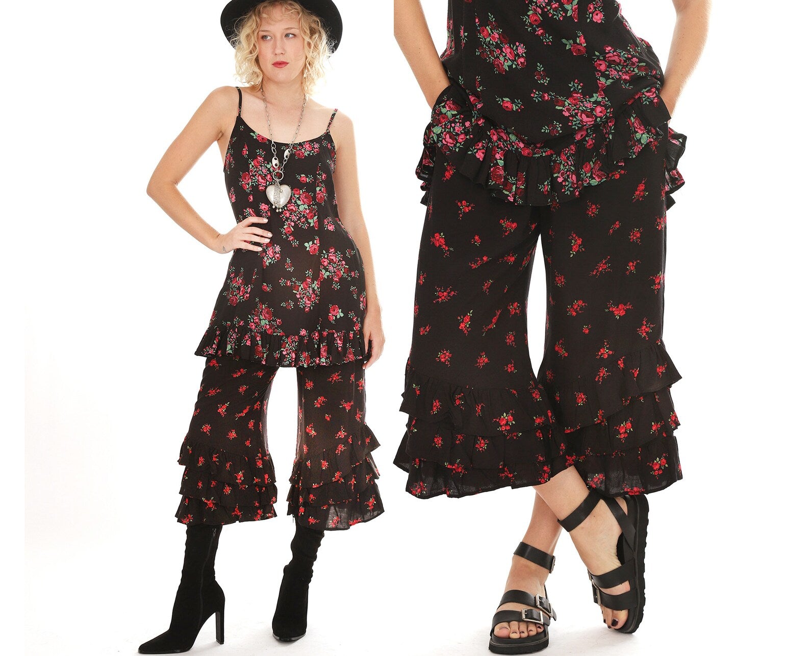 Black and Red Rose Floral Ruffled Bloomer Pants. Add a pop of color to your black outfit! Our new Hannah Bloomers are So gorgeous, SO COZY and so much fun! Wear Casually with a pair of boots, or Dressed peaking out from under a dress, or with a silky Top. Beautiful small bouquets of red roses in a super soft Lovely Rayon Challis Fabric is so comfy and flows so beautifully when you move! Fabulous with our Black Flare Top Thumbhole Frenchie's too!
