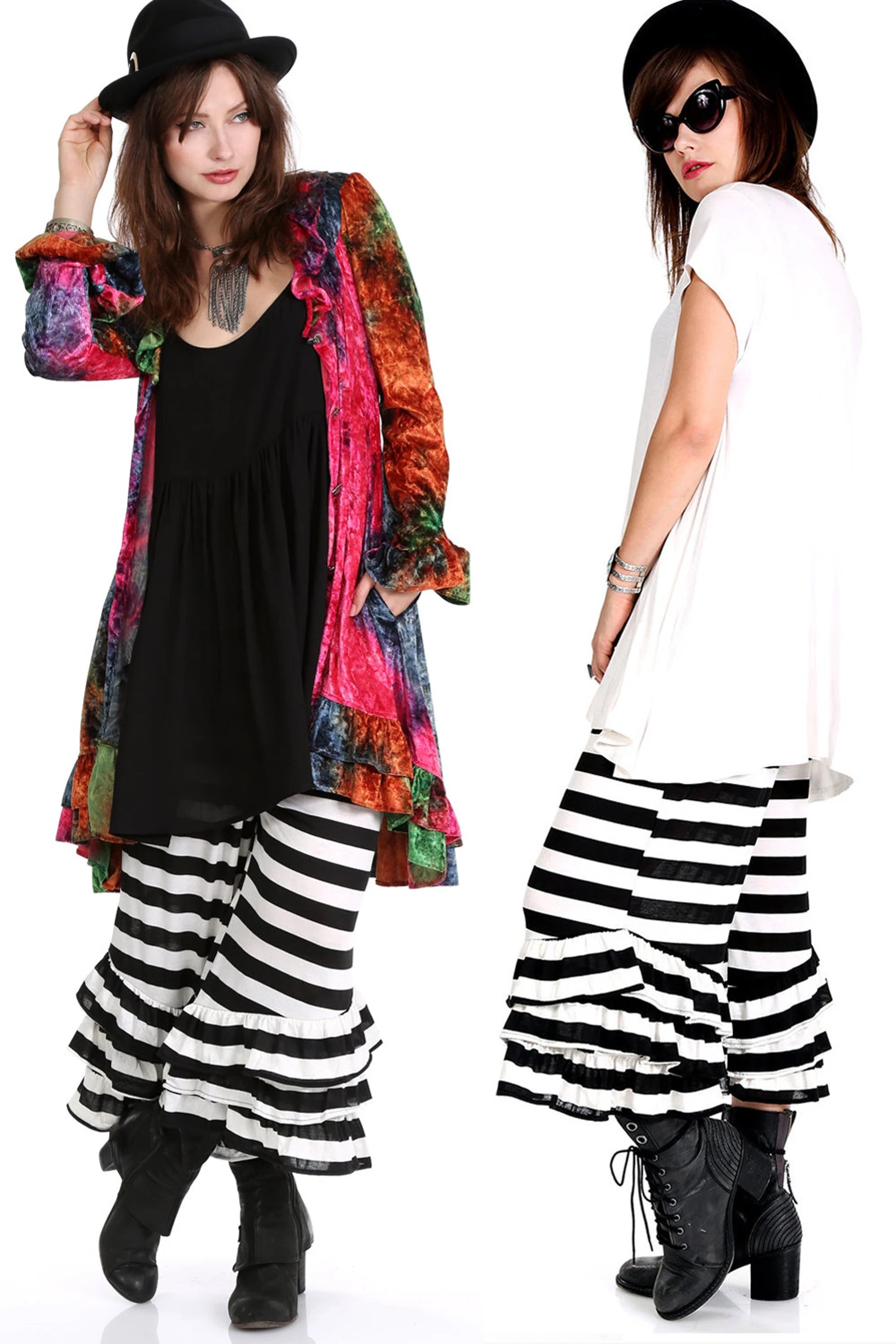 Susie Stripe Black And White Striped Ruffle PantalOONIE Bloomers with Pockets in super soft, chic and easy to wear rayon spandex. Great for Vacations, Resort Wear, and everyday wear. So many ways to wear them and super comfortable with elasticized waist. They come in two sizes, Small-Medium and Large to XXL. The body of the Bloomers are the same in both sizes, it's just the difference in the size of the elastic that make them a P-M or L-XL.
