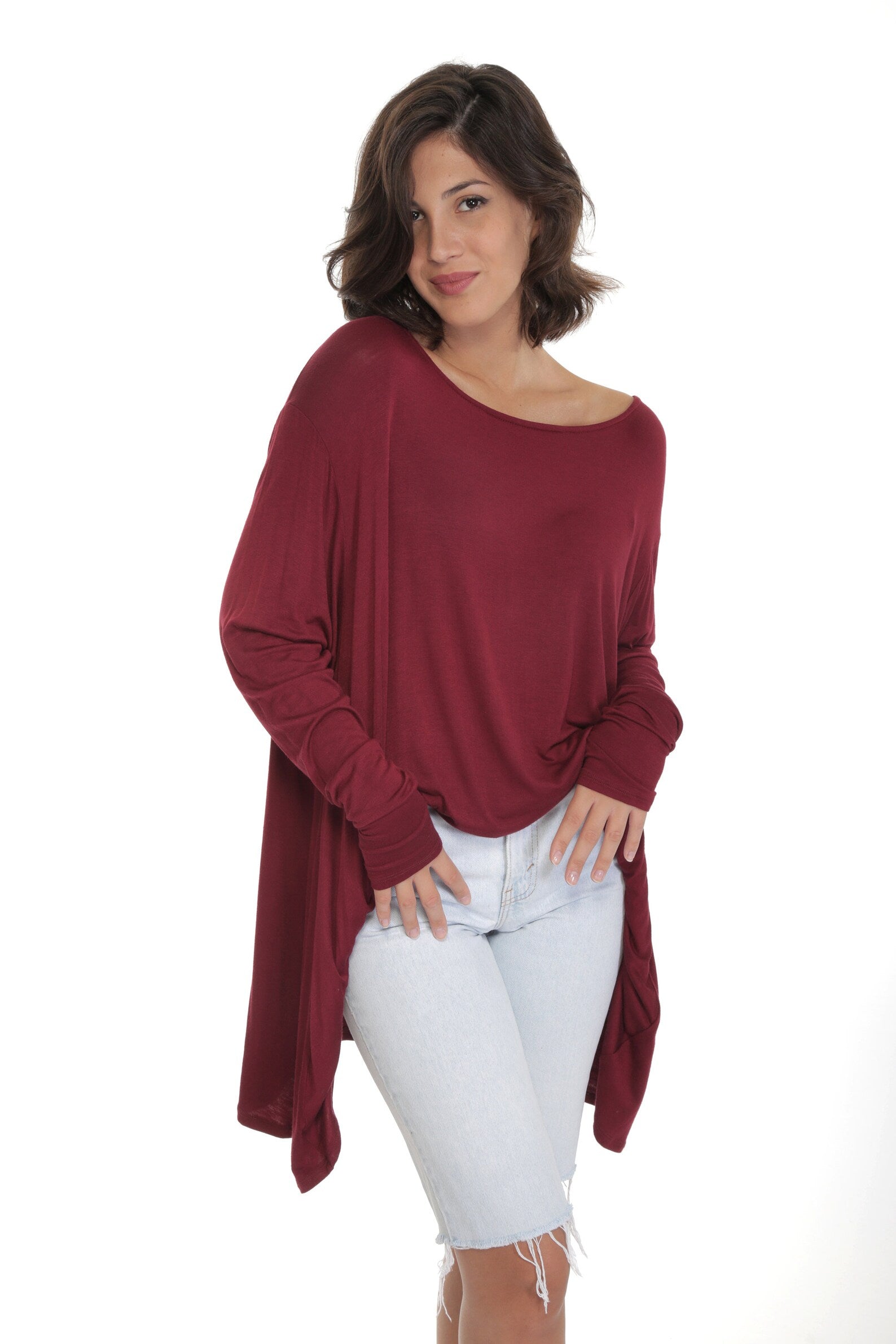 Burgundy Flared Bottom FRENCHIE Top with Long Sleeves and Thumbholes. Made of Mushy soft, feels like Cashmere delicious brushed Rayon Spandex. Full swing bottom is a bit shorter in the front than the sides and back, and super flattering for all body types. Great with Jeans, Shorts, Skirts and so comfy you'll wanna sleep in it! Great to throw in your bag when for the evening, or just when you need something light, yummy and fashionable to throw over you at the Beach or dinner. Join the Frenchie Brigade! Once you wear one you want a Frenchie in all the fabrics WhatWouldSusieWear has to offer! Just the Perfect Top!