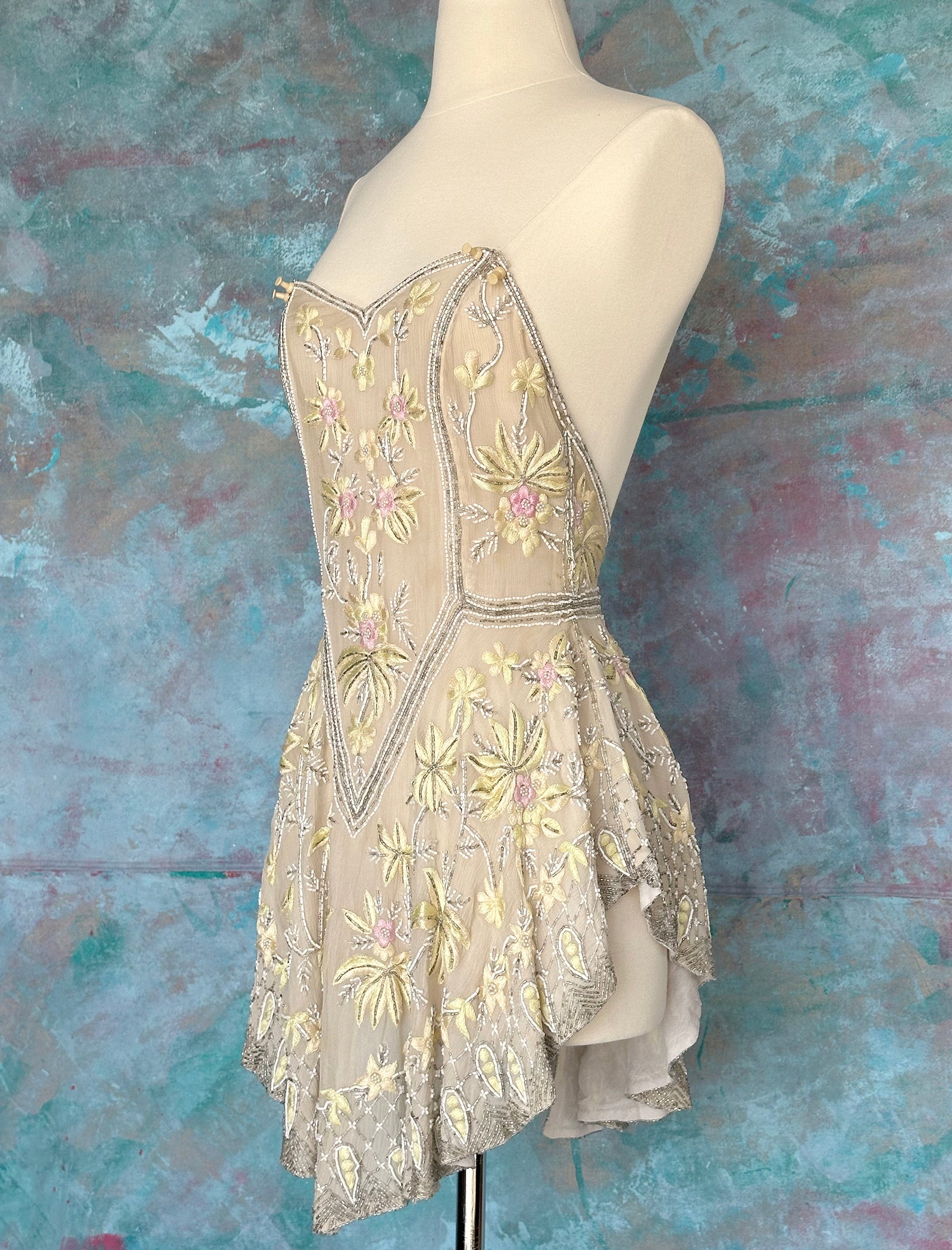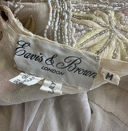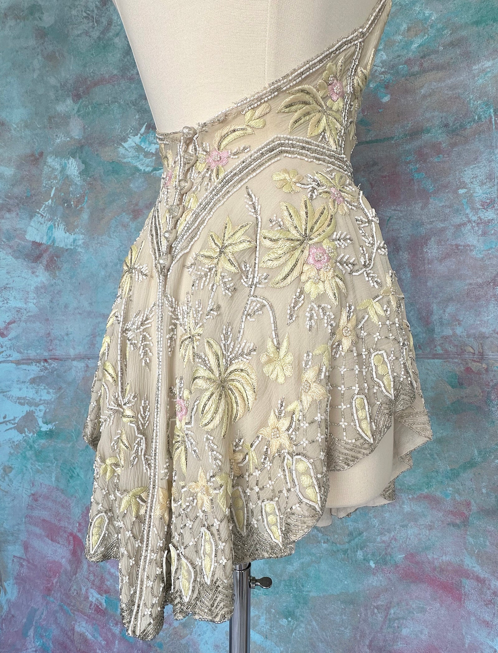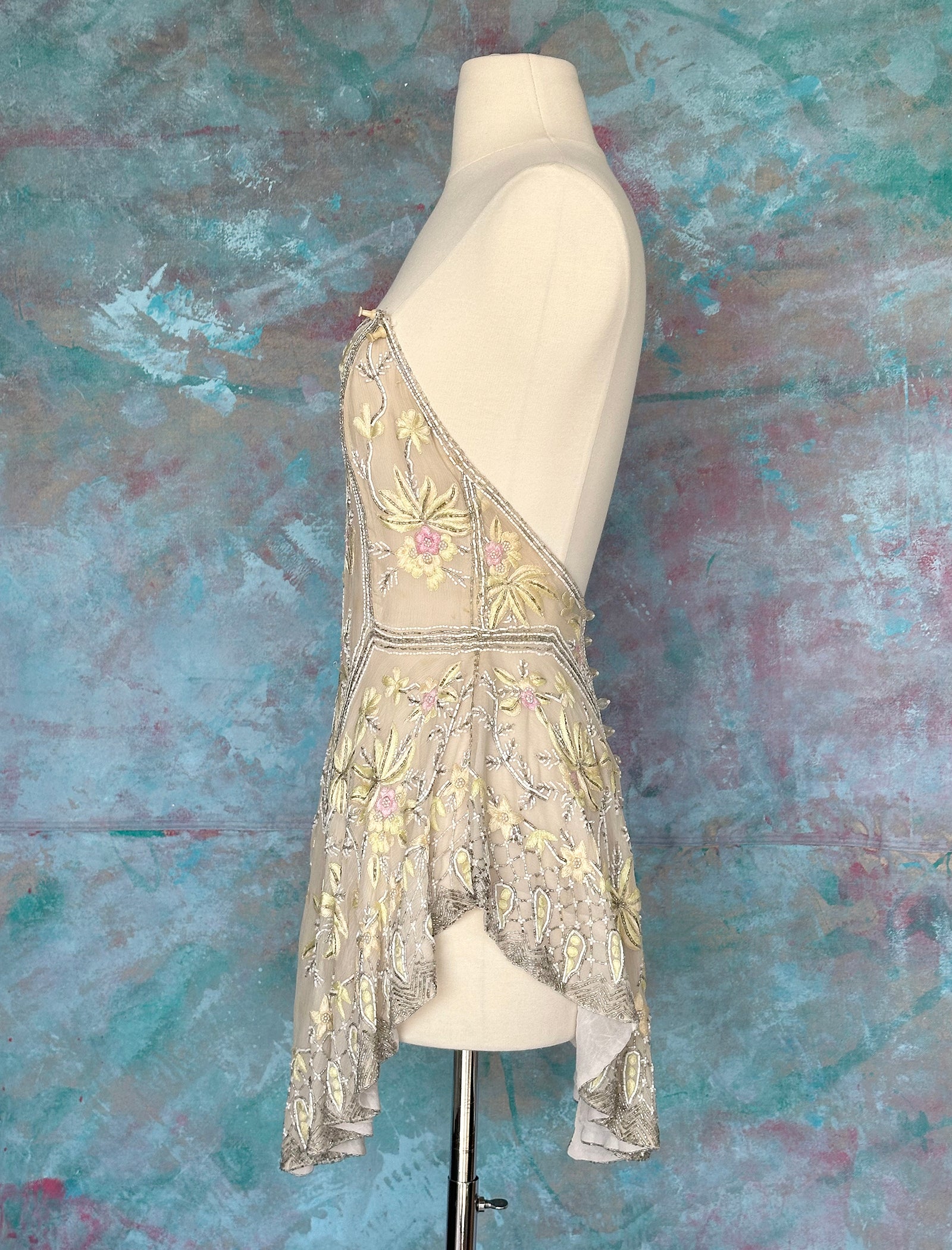 Rare Eavis and Brown of London Heavily Embroidered and Beaded Asymmetrical Beigy Ivory Corset Style Top with amazingly gorgeous Baby Pink, Soft Yellow Embroidered Flowers with Silver, White cylinder beads as well as small sound pearlized beading in the middle of the flowers. The entire hemline is beaded with silver beading. The dress is fully lined with There is boning in the front bodice which dips into a deep v in the front and the back edged in silver and white beading. The low back is closed with round faceted clear iridescent buttons that close fabric hooks.This top splits opens up in the back under the button closures. Everything about this piece is so amazing. So much stunning detail. If you don't want to wear it strapless you could have a seamstress put in straps or sew in a beautiful lace ribbon to the top of the V at the bust-line and tie it around like a halter top. This is really one my most favorite prized finds. If it fit I would keep it! But hopefully it will find someone who will love it as much as I do!