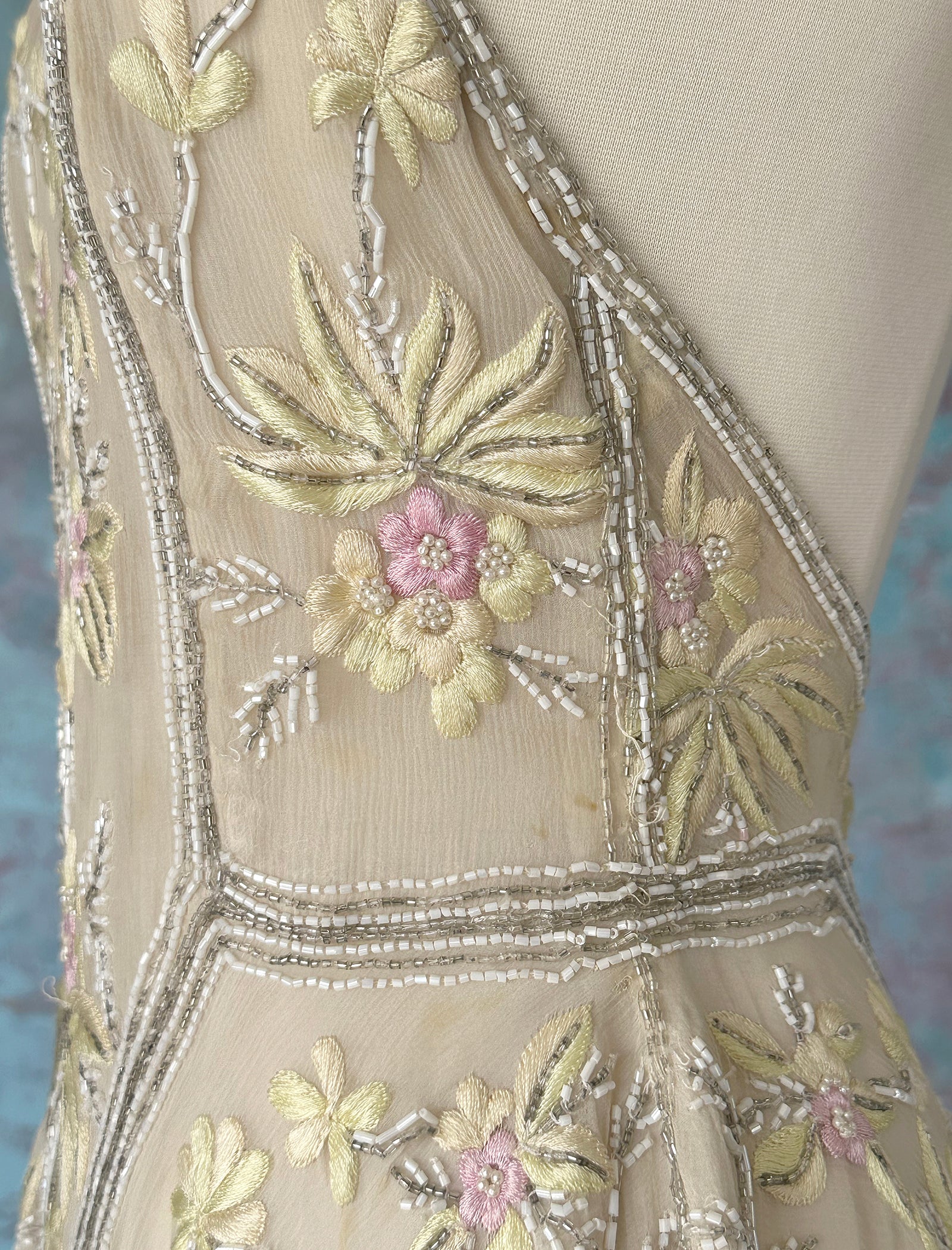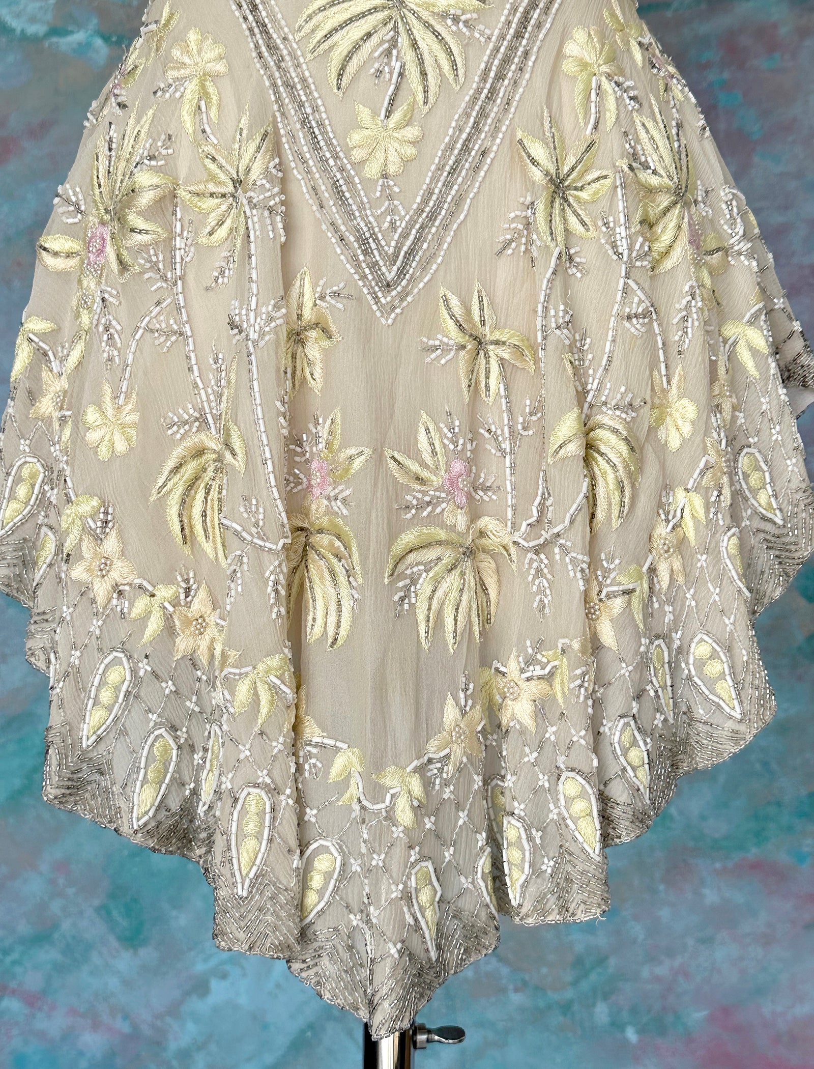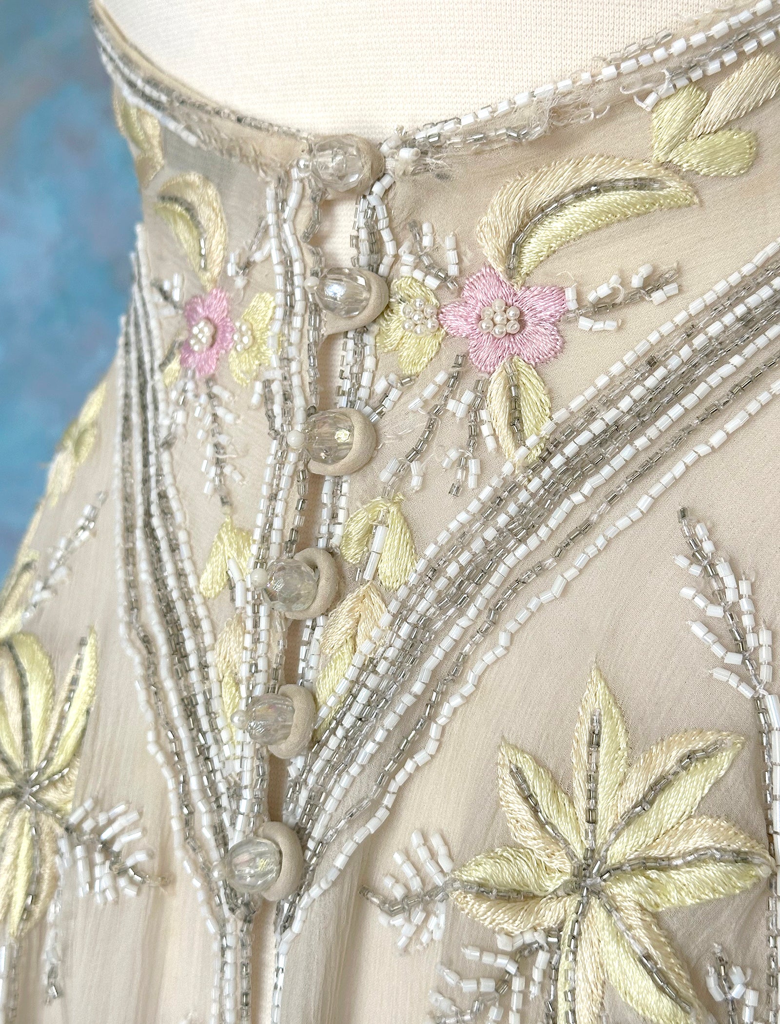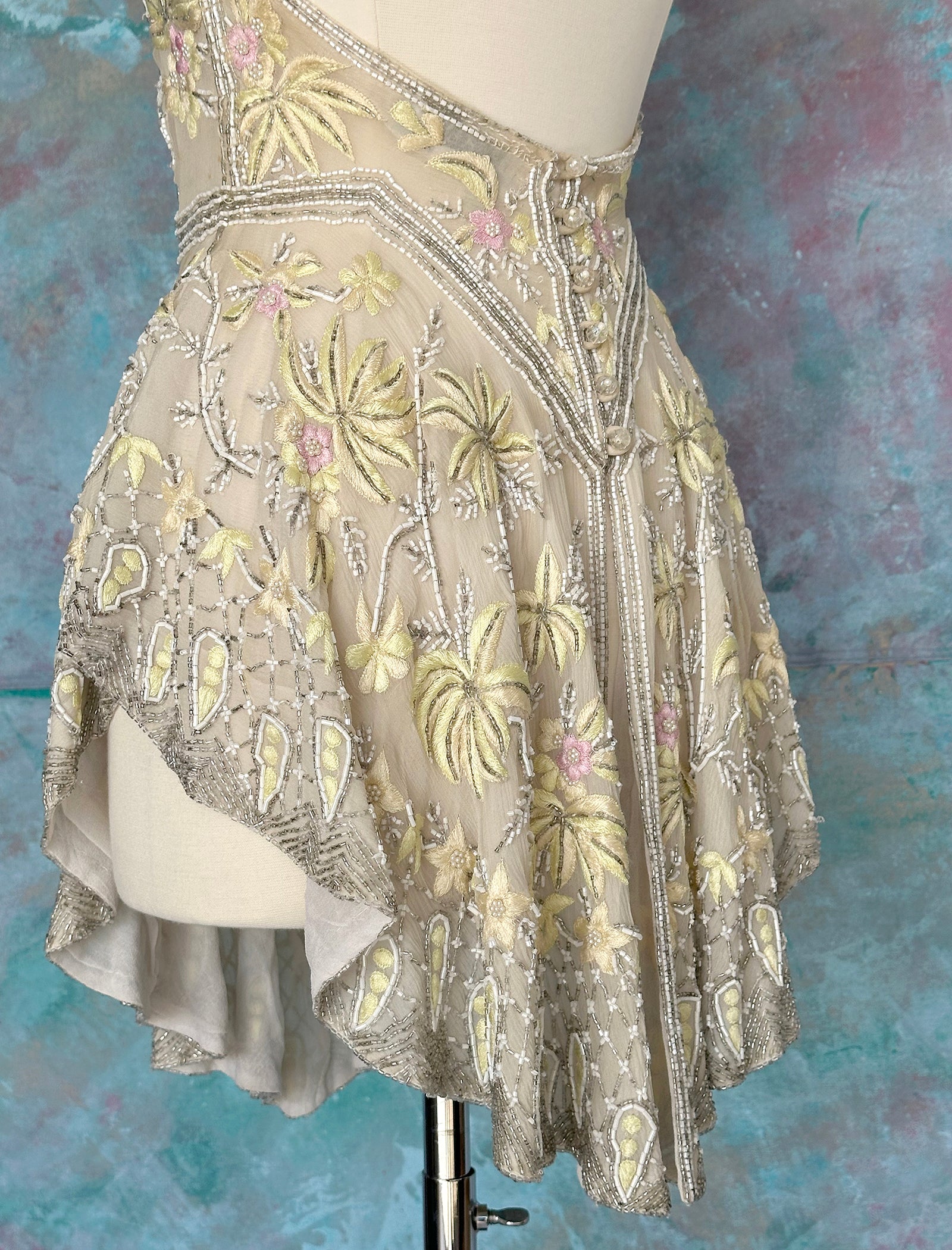 Rare Eavis and Brown of London Heavily Embroidered and Beaded Asymmetrical Beigy Ivory Corset Style Top with amazingly gorgeous Baby Pink, Soft Yellow Embroidered Flowers with Silver, White cylinder beads as well as small sound pearlized beading in the middle of the flowers. The entire hemline is beaded with silver beading. The dress is fully lined with There is boning in the front bodice which dips into a deep v in the front and the back edged in silver and white beading. The low back is closed with round faceted clear iridescent buttons that close fabric hooks.This top splits opens up in the back under the button closures. Everything about this piece is so amazing. So much stunning detail. If you don't want to wear it strapless you could have a seamstress put in straps or sew in a beautiful lace ribbon to the top of the V at the bust-line and tie it around like a halter top. This is really one my most favorite prized finds. If it fit I would keep it! But hopefully it will find someone who will love it as much as I do!