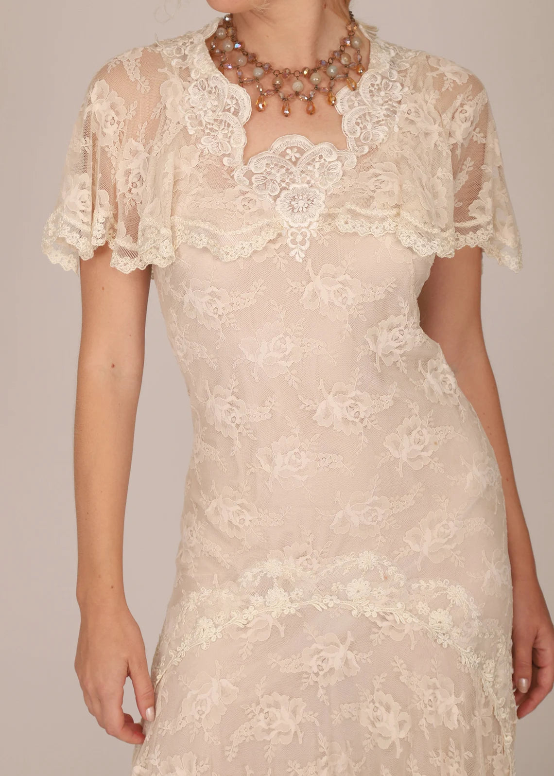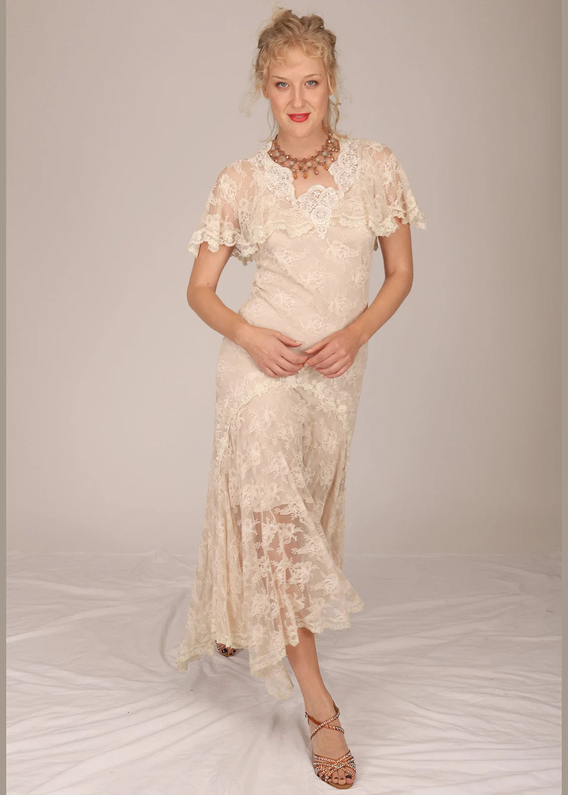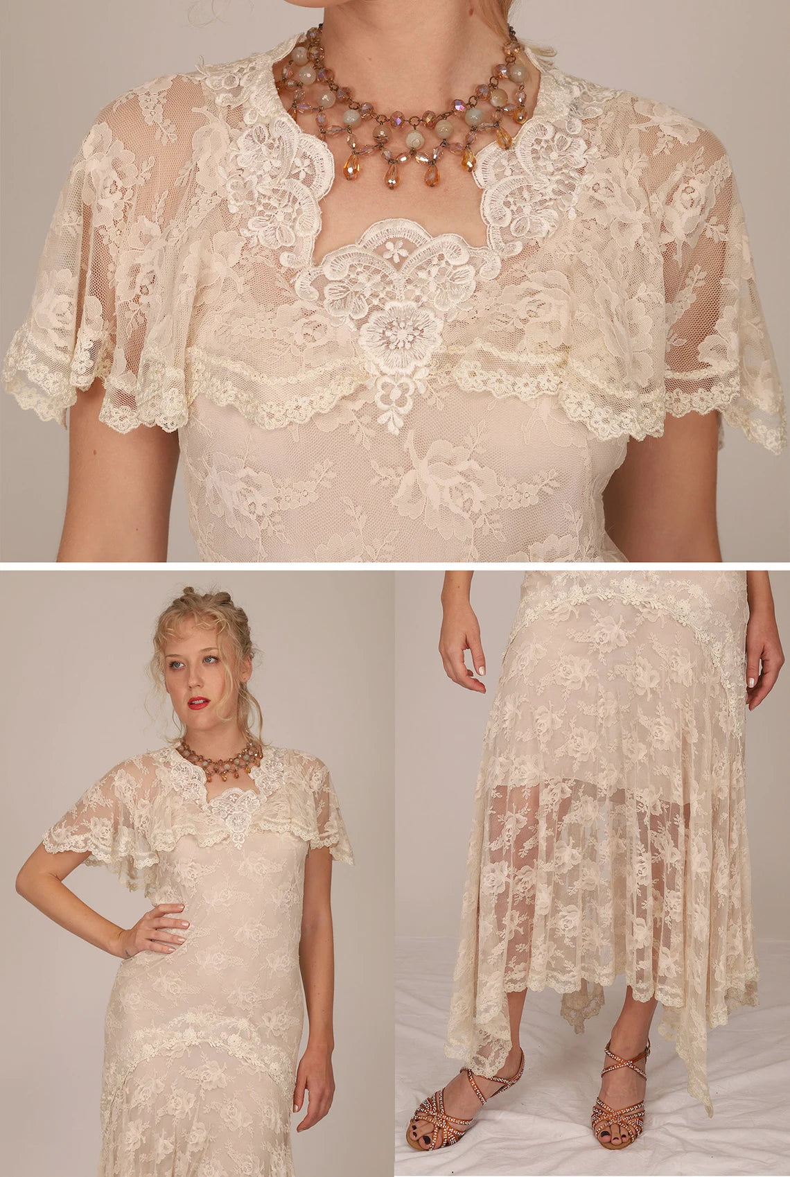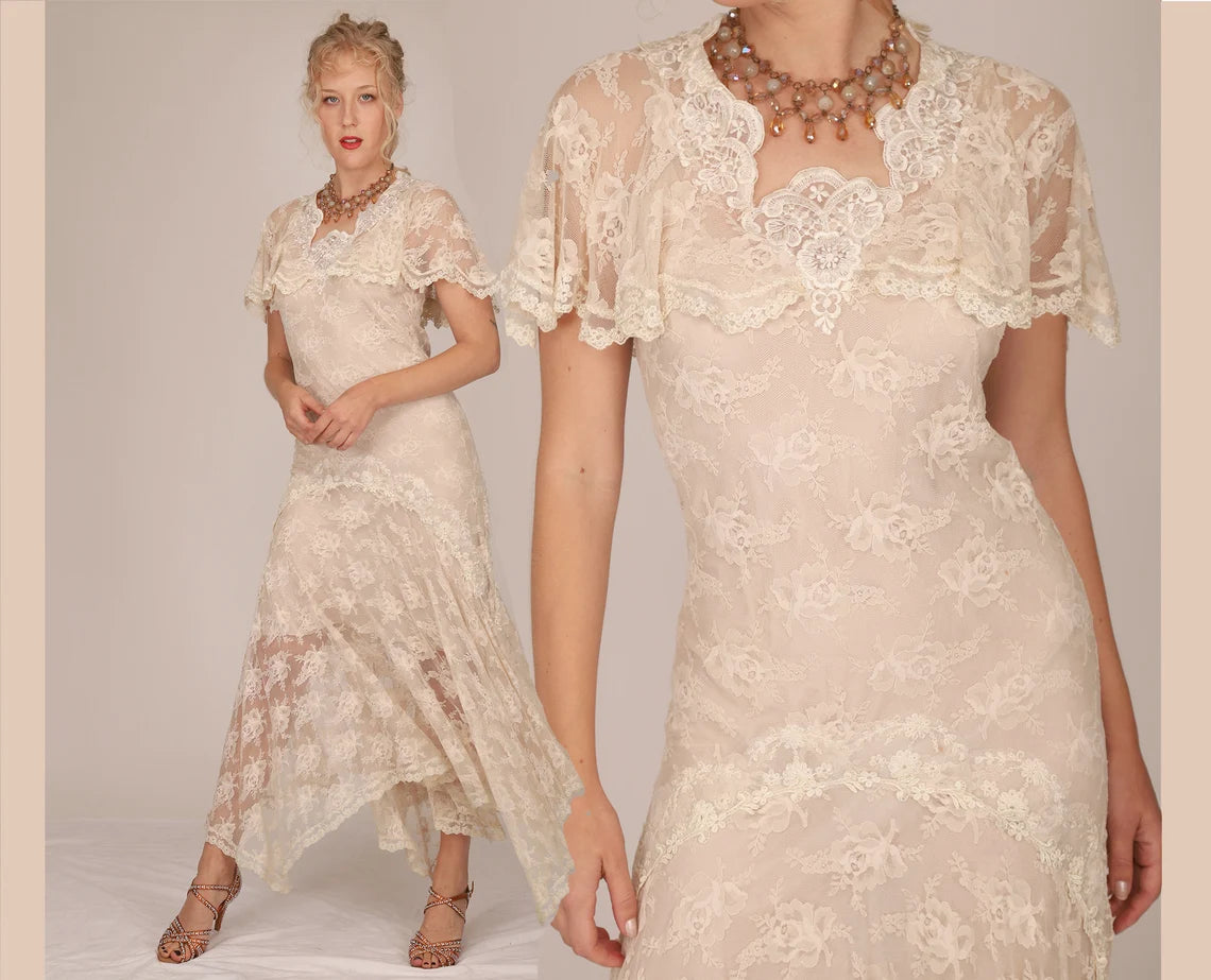 Vintage 1930s Lace Ivory Flutter Sleeve Flapper Drop Waist Maxi Dress, with Asymmetrical Hemline, Amazing Flutter Collar that drapes down along your back. Magnificent Lace Rose Floral Pattern, with unusual neckline. Perfect for a vintage Wedding or just because you want to wear something beautiful. Wear with heels, or cowboy boots. Either way you will look so feminine and wearing such a gorgeous vintage piece that is as current today as it was when it was made. Just a stunning dress! I show the dress with a short silk slip beneath. **PLEASE NOTE. THIS ITEM IS NOT RETURNABLE.** If you have any questions regarding this item please message me.