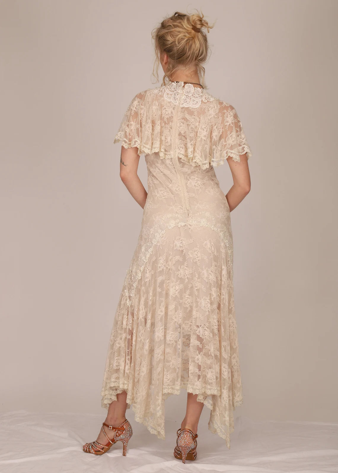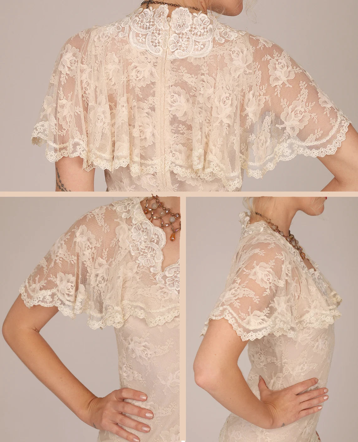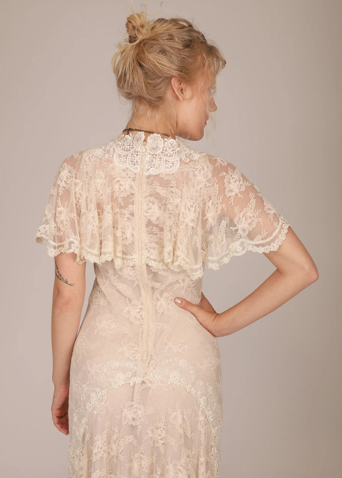 Vintage 1930s Lace Ivory Flutter Sleeve Flapper Drop Waist Maxi Dress, with Asymmetrical Hemline, Amazing Flutter Collar that drapes down along your back. Magnificent Lace Rose Floral Pattern, with unusual neckline. Perfect for a vintage Wedding or just because you want to wear something beautiful. Wear with heels, or cowboy boots. Either way you will look so feminine and wearing such a gorgeous vintage piece that is as current today as it was when it was made. Just a stunning dress! I show the dress with a short silk slip beneath. **PLEASE NOTE. THIS ITEM IS NOT RETURNABLE.** If you have any questions regarding this item please message me.