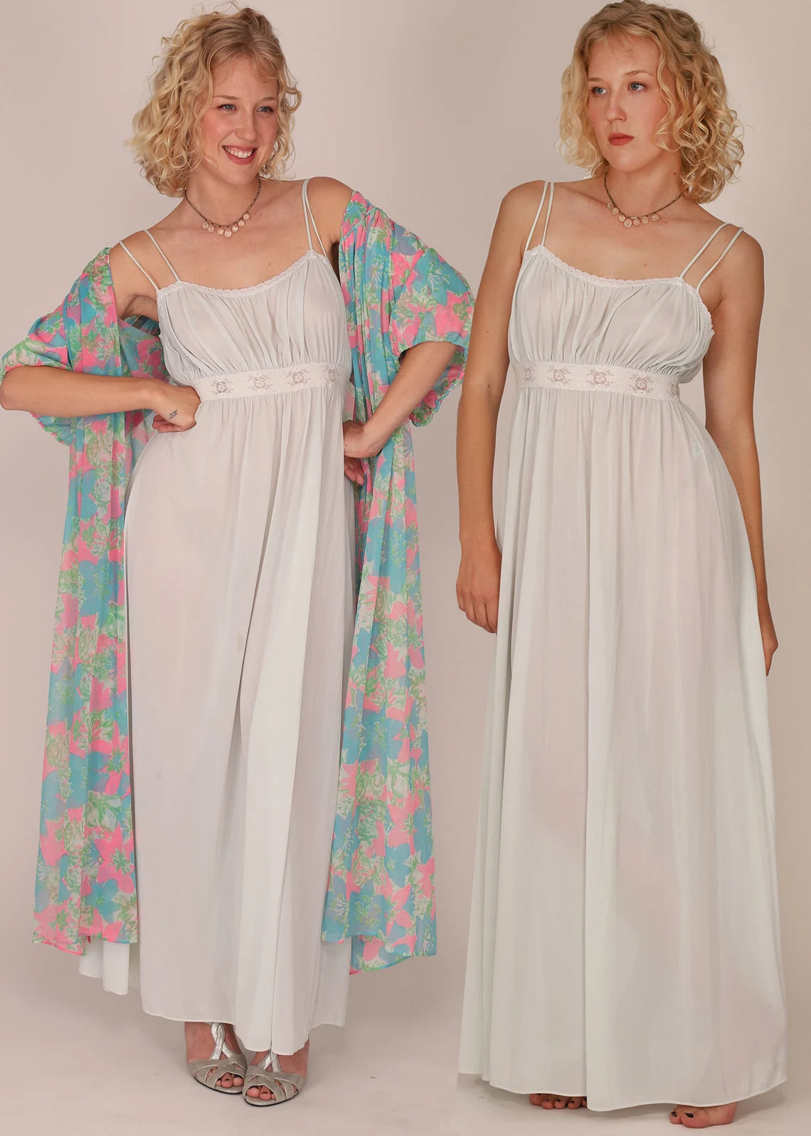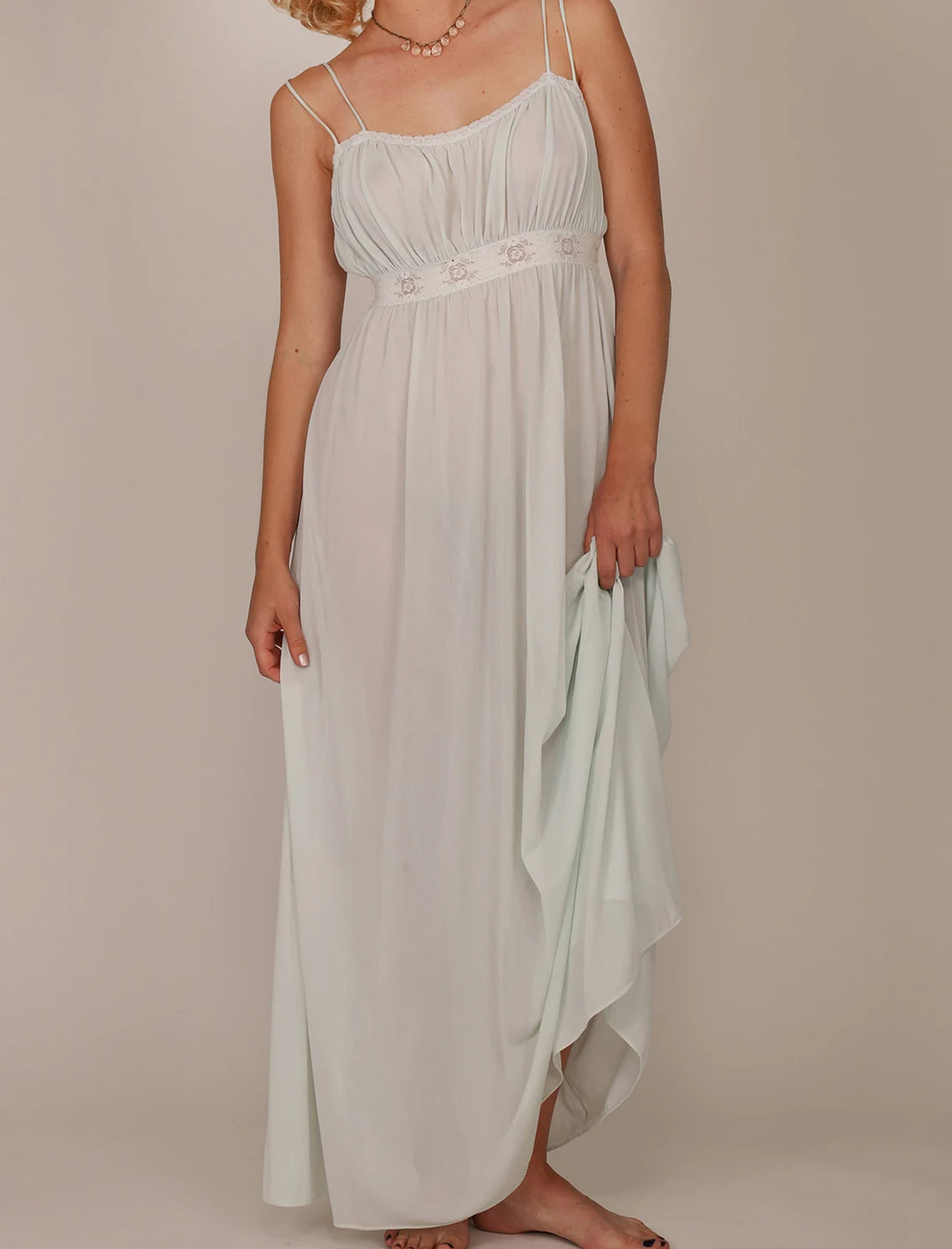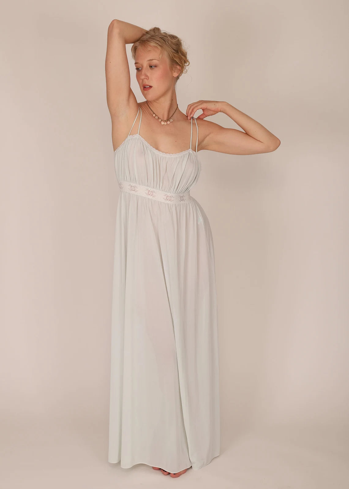 Vintage 1950s Light Blue Nylon and Lace Empire Waist Negligee with double spaghetti straps. So pretty and ultra feminine. A lovely light shade of blue with a white floral elasticized band.Super light and comfortable and sexy!!