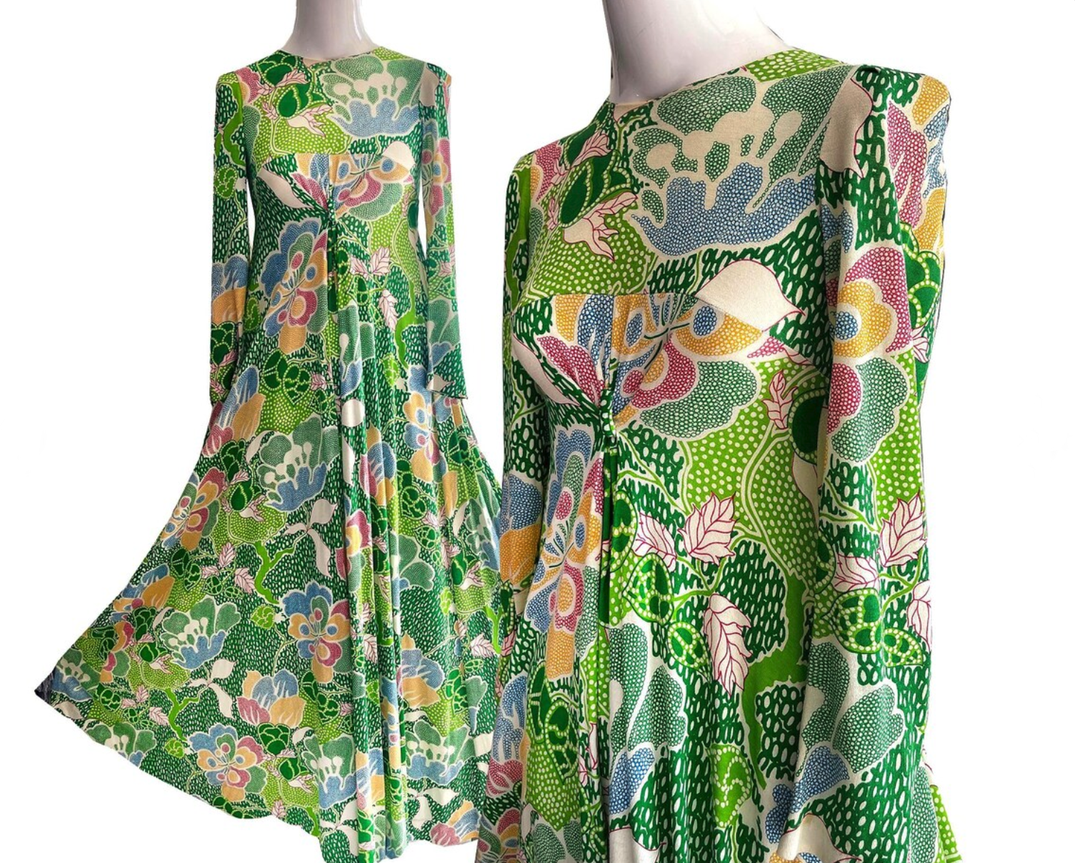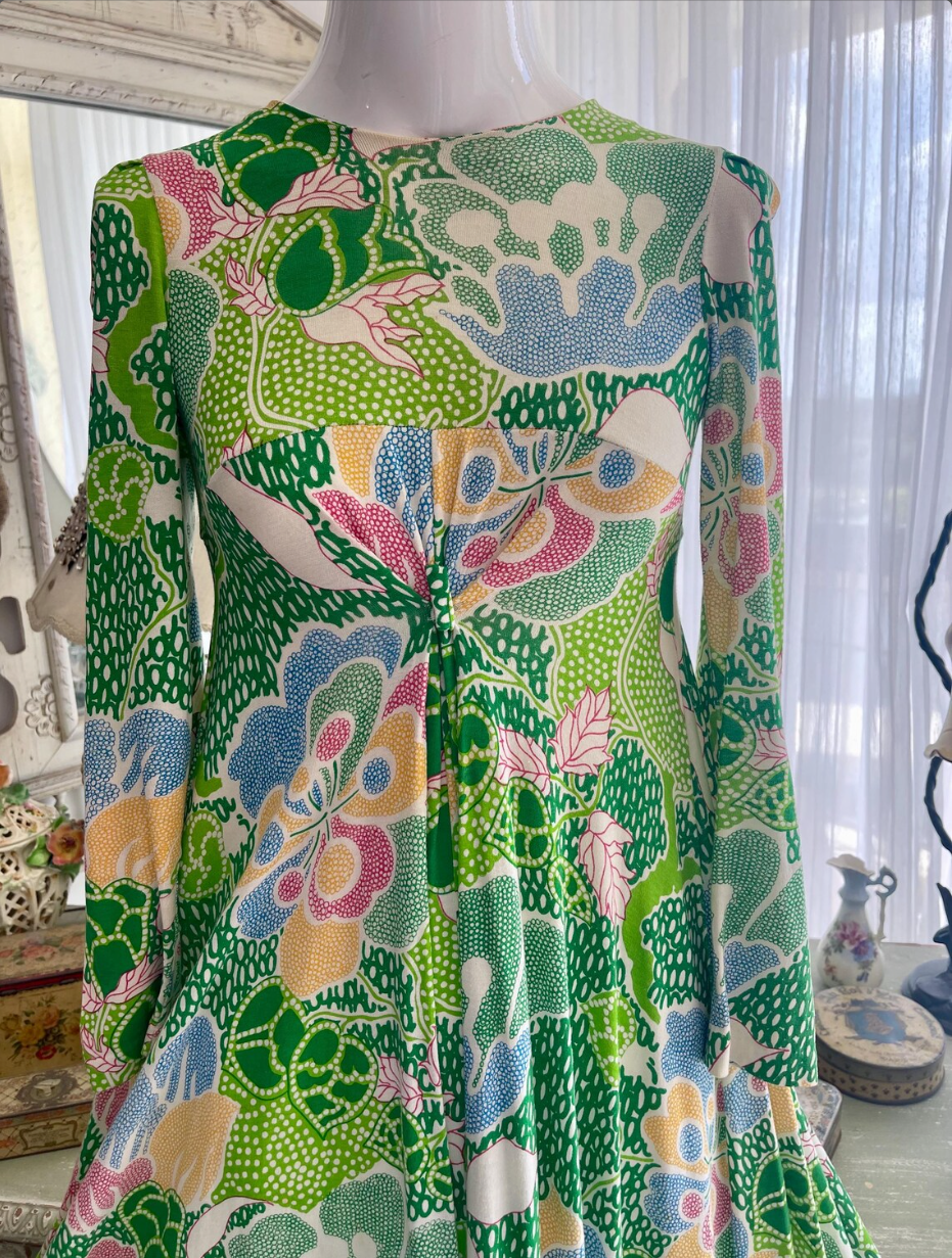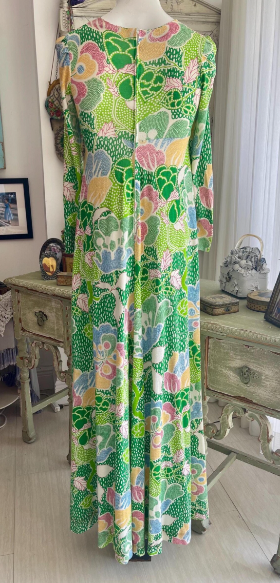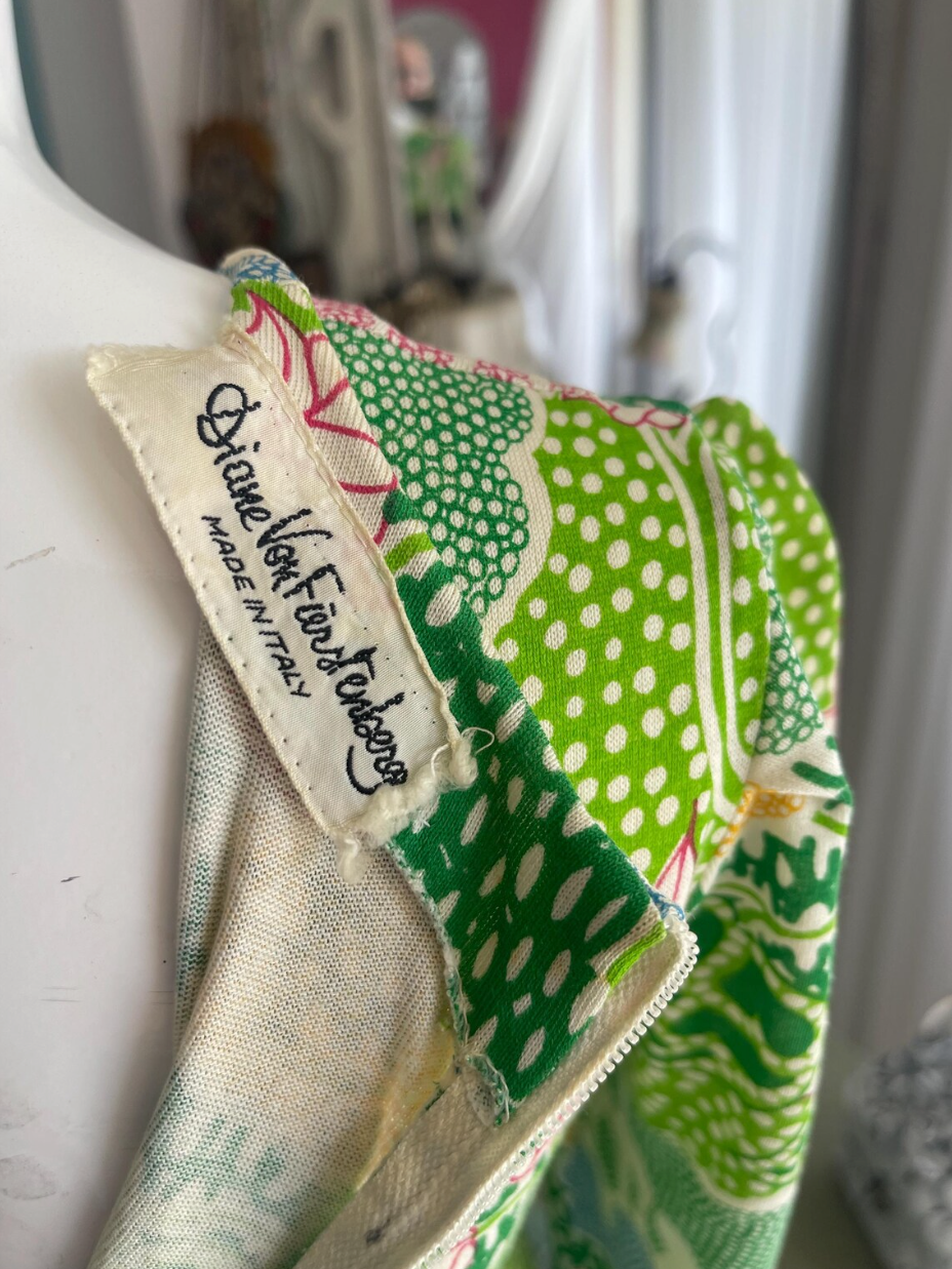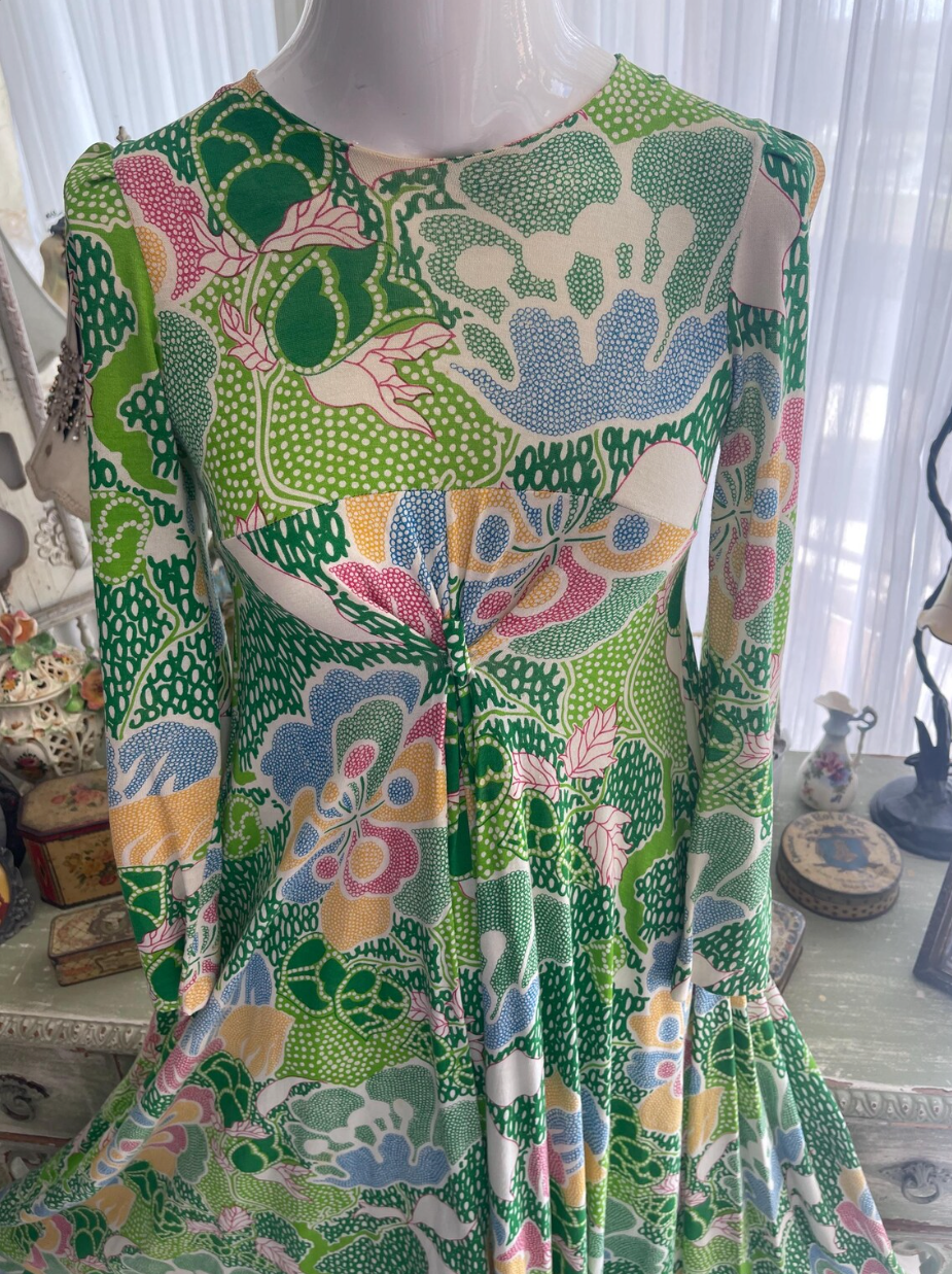 Rare 1970s Diane Von Furstenberg Mod Floral Print Maxi Dress with high scoop neck collar that is collected mid breast, is tight at the bodice and then has a full sweep maxi skirt with gorgeous movement in a soft brushed cotton jersey. Such a fabulous Mod Print of Flowers and dots in shades of Green Yellow, Red and Turquoise. Just a WOW find, and will look great with heels or boots. Sandals or barefoot. With or without jewels. I just adore this dress and think you will too! The dress is long but you can always make it shorter. Such an amazing piece!!!! There is give to this dress but I do think it would best fit a Petite to medium frame depending on desired fit.