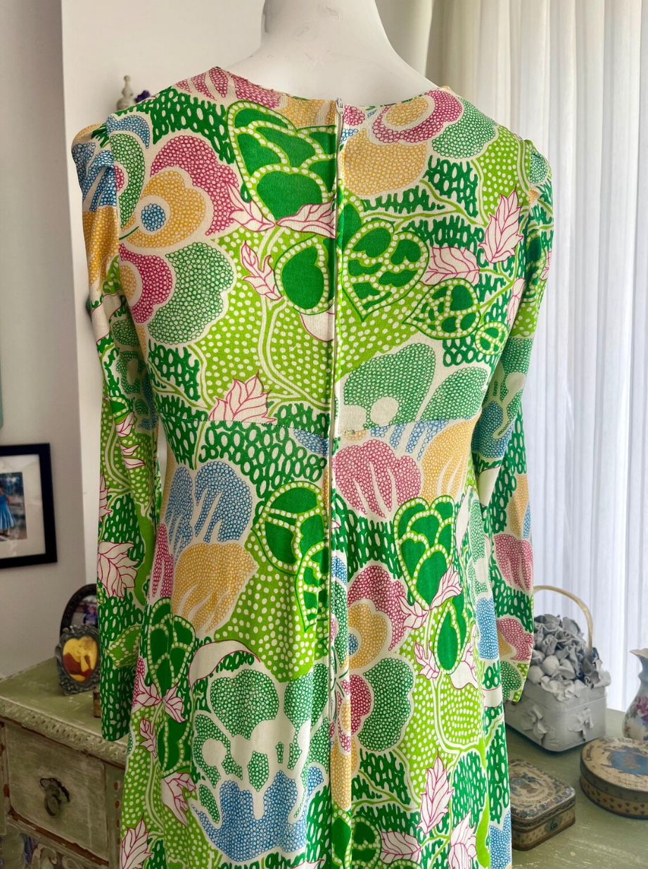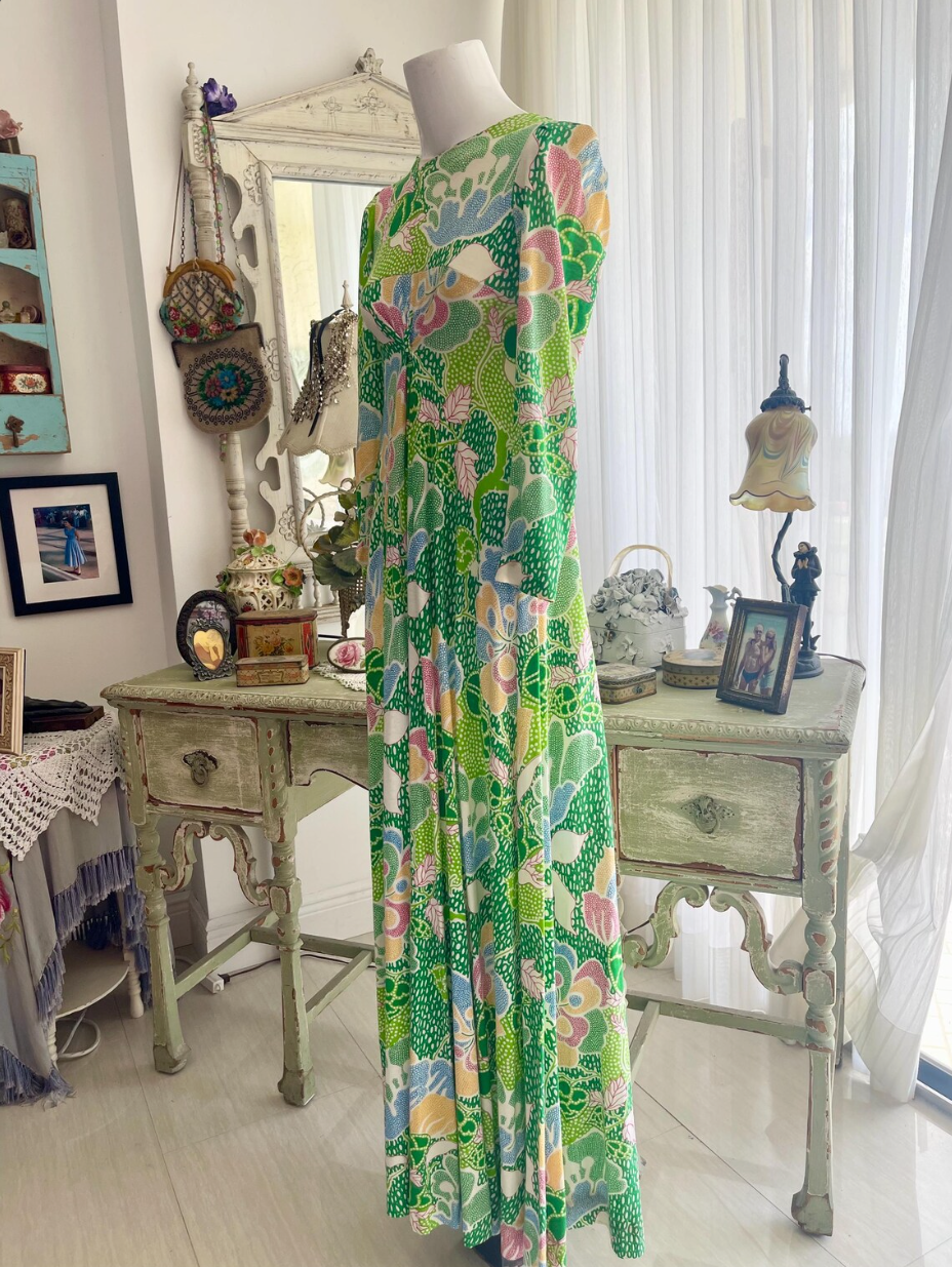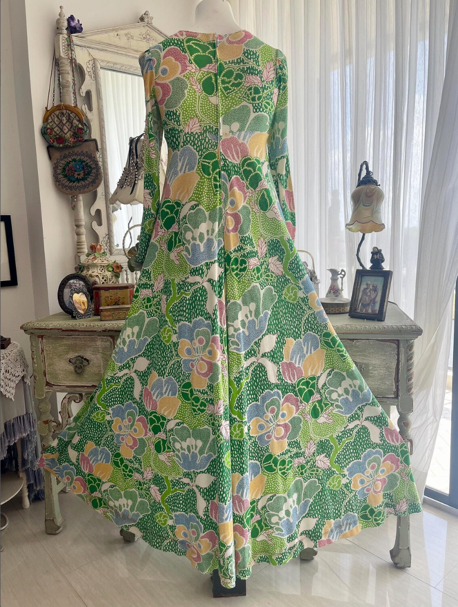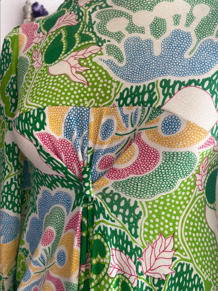 Rare 1970s Diane Von Furstenberg Mod Floral Print Maxi Dress with high scoop neck collar that is collected mid breast, is tight at the bodice and then has a full sweep maxi skirt with gorgeous movement in a soft brushed cotton jersey. Such a fabulous Mod Print of Flowers and dots in shades of Green Yellow, Red and Turquoise. Just a WOW find, and will look great with heels or boots. Sandals or barefoot. With or without jewels. I just adore this dress and think you will too! The dress is long but you can always make it shorter. Such an amazing piece!!!! There is give to this dress but I do think it would best fit a Petite to medium frame depending on desired fit.