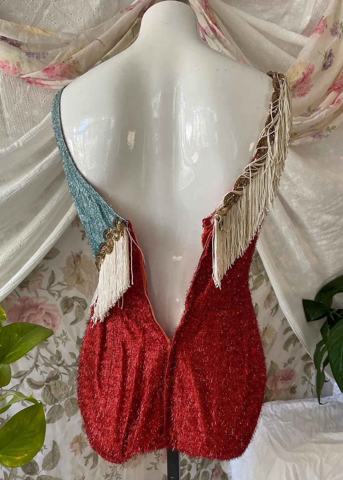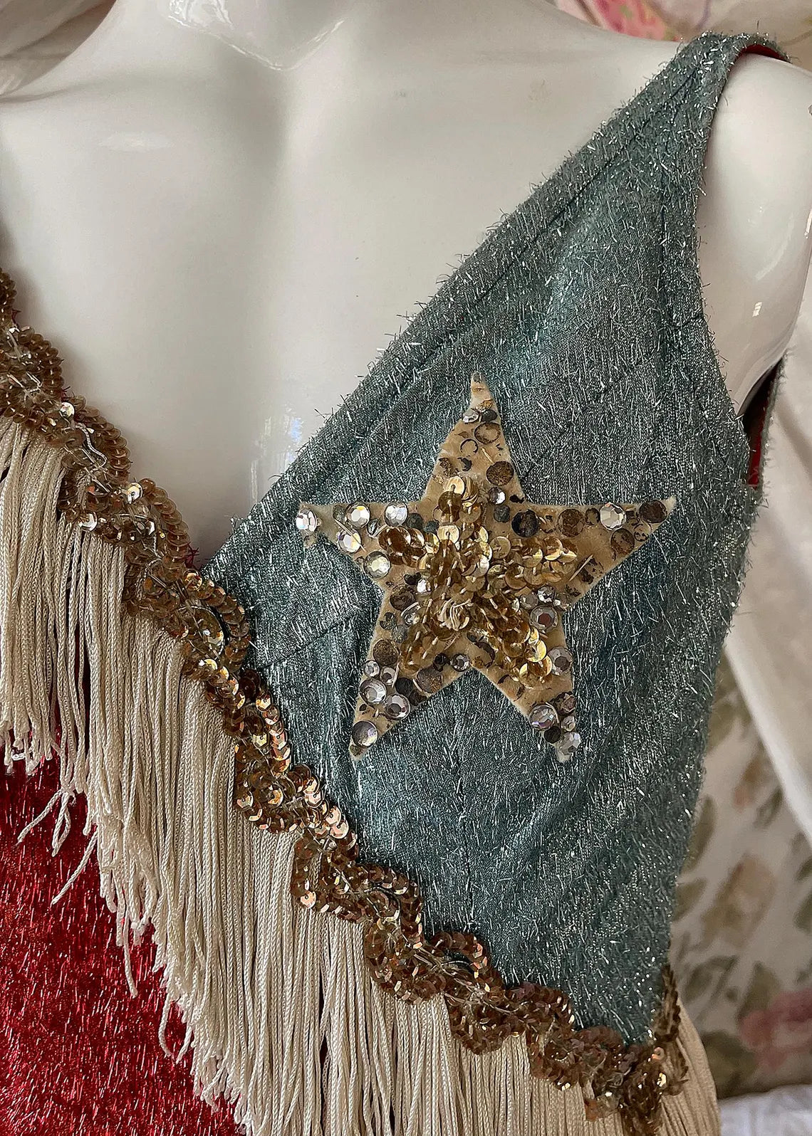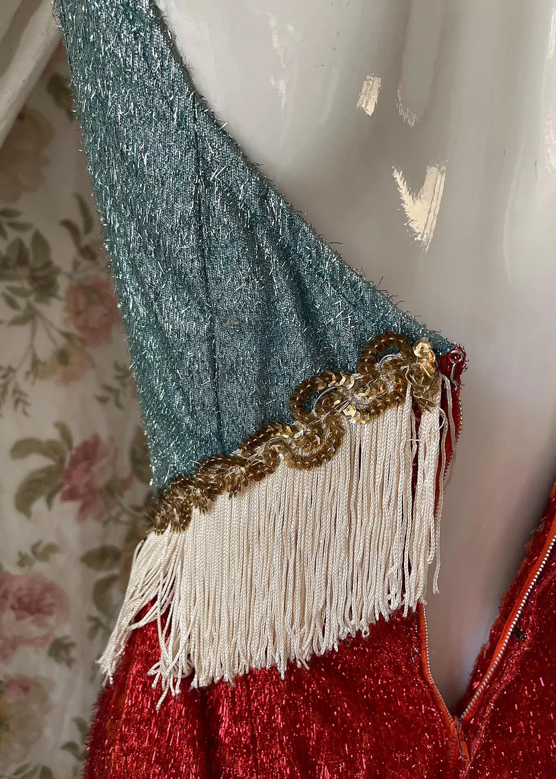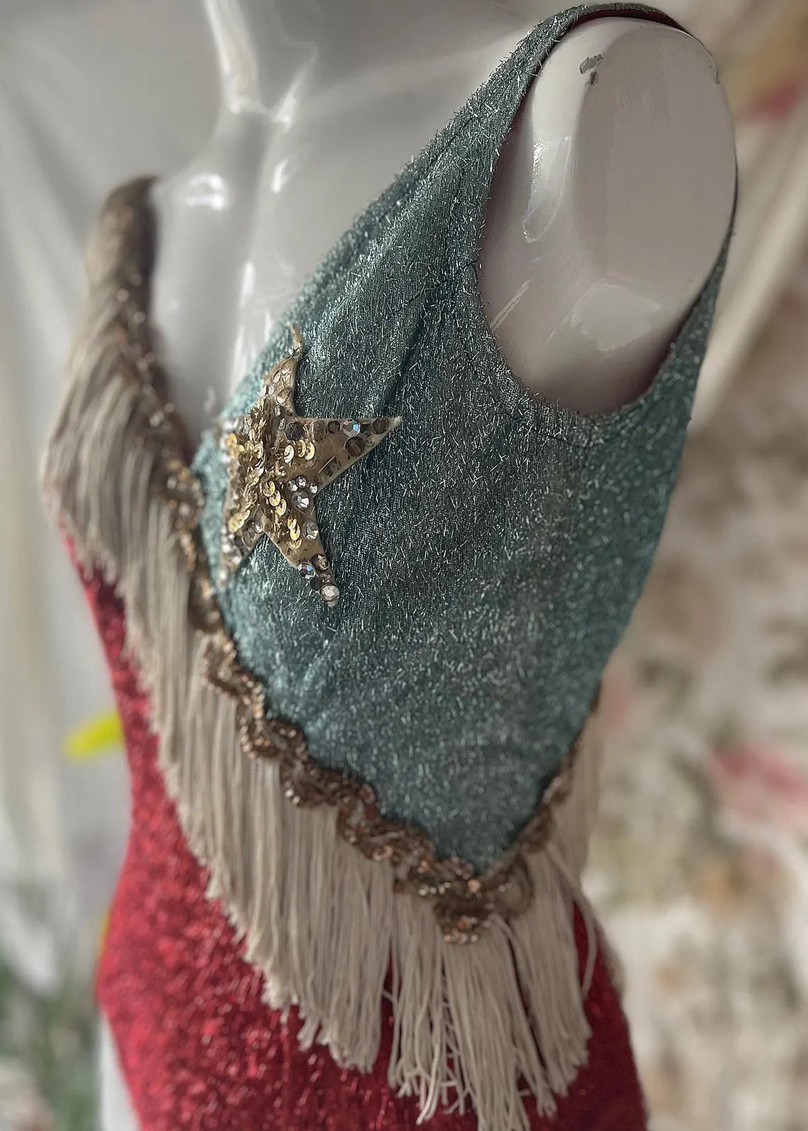 Vintage Authentic Circus of The Stars Red Costume. A rare find indeed. I have had this piece for well over 30 years. I really never expected to sell it as it became a calling card when I would do vintage shows. I would hang it in the middle of my booth to attract attention and attention it got! One day a young man who worked in the TV and film industry stopped at my booth and told me what I had. He said that he worked on the show and remembered this costume. He said you really do have a piece of Vintage Americana History there! This really became a treasure to me and now it can be yours to treasure. You might just want to hang it on the wall! It's such a great conversation piece, but go ahead and wear it if it fits. All you need are a pair of White GoGo boots and out you go! PLEASE NOTE: DUE TO THE RARITY OF THIS ITEM, IT IS NOT RETURNABLE. Please feel free to ask questions. ***PLEASE NOTE: THE ZIPPER WORKS PERFECTLY. **If you would like to hear more about this piece please copy and paste this link to see video: https://www.facebook.com/watch/?v=751841034828260&rdid=vmVFiAVjhwiPoc4p