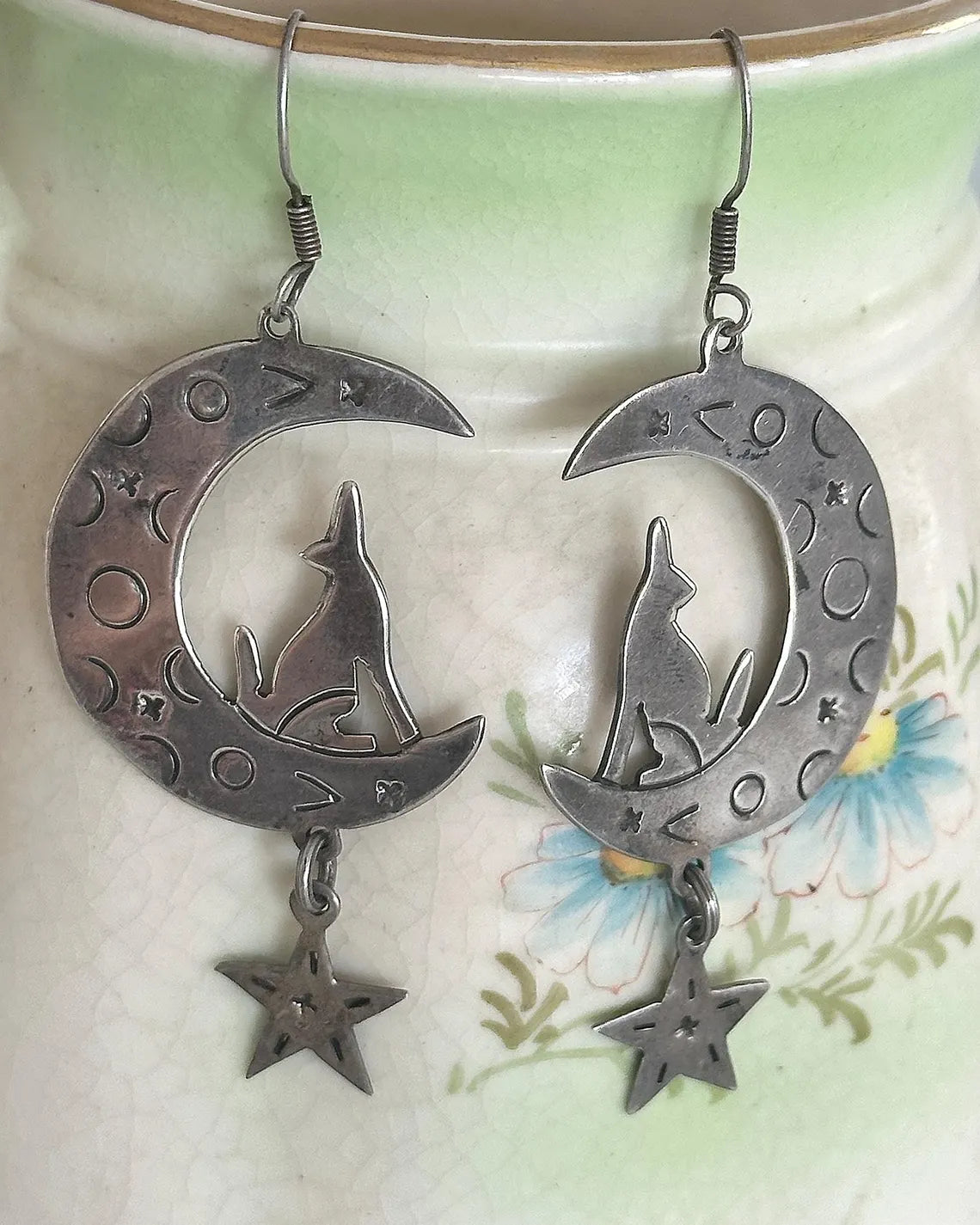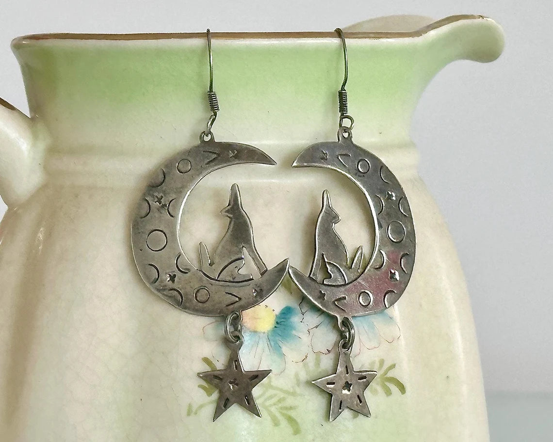 Vintage 925 Sterling Silver Coyote Howling at The Moon and Star Stamped Drop Earrings with Silver Ear Hooks. Gently tarnished. Can be cleaned more if you prefer them that way. I personally love them a bit aged. Such a unique, charming design. Lightweight and easy to wear.