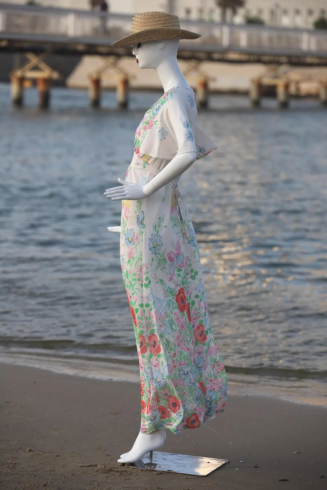 Vintage 70s White Floral BohoBell Sleeve Maxi Dress with V Neck that ties to the back, with the most amazing Pastelly Floral Print. I have rarely seen such a beautiful print. Like a vintage Floral Painting! Super soft and lightweight vintage Nylon. You will feel like you aren't wearing anything. Perfect for a hot day with a pair of sandals, with a pair of heels, or with a pair of Cowboy Boots. One of the prettiest dresses I have come upon! Zips up the back.