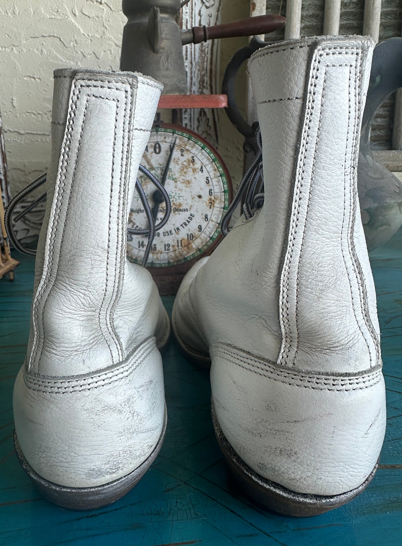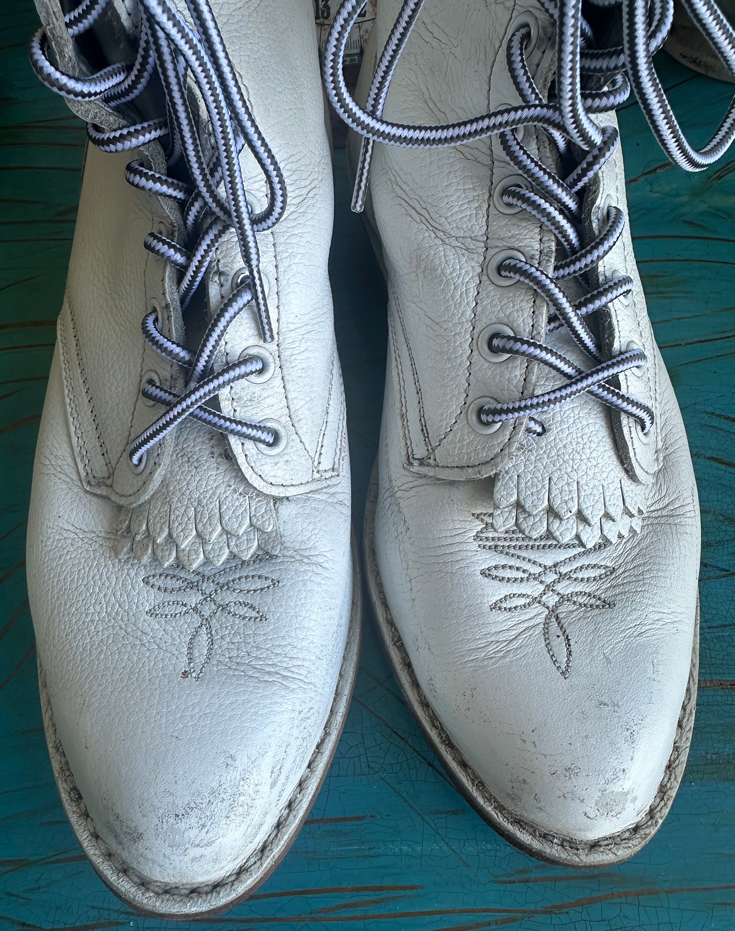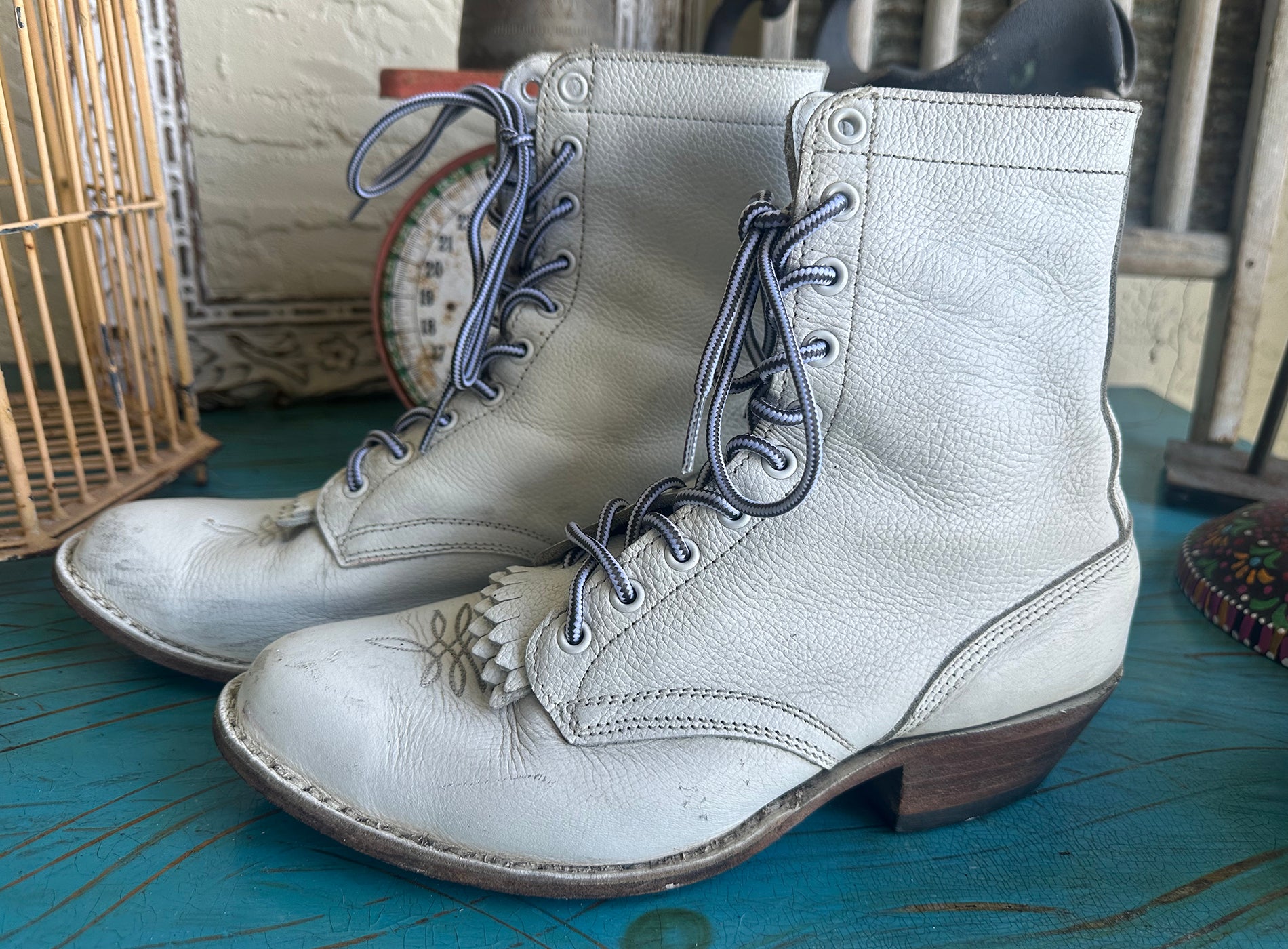 Rare Vintage 70s White Wide Lace Up Logger Kiltie Boots Extra Wide. Super soft leather. Perfectly distressed and worn in for super comfort! Would look fabulous with a pair of jeans, shorts or with a flowy western skirt. I wish they fit me! They are extra wide so PLEASE CHECK measurements to assure a proper fit. Compare the dimensions to your own boots and your feet. The Person I bought from said they were and 8 but they are bigger. I wear an 8 and they have an extra inch at least in the toe area. I had to write a size so I wrote 9F but please compare to yoru own boots!