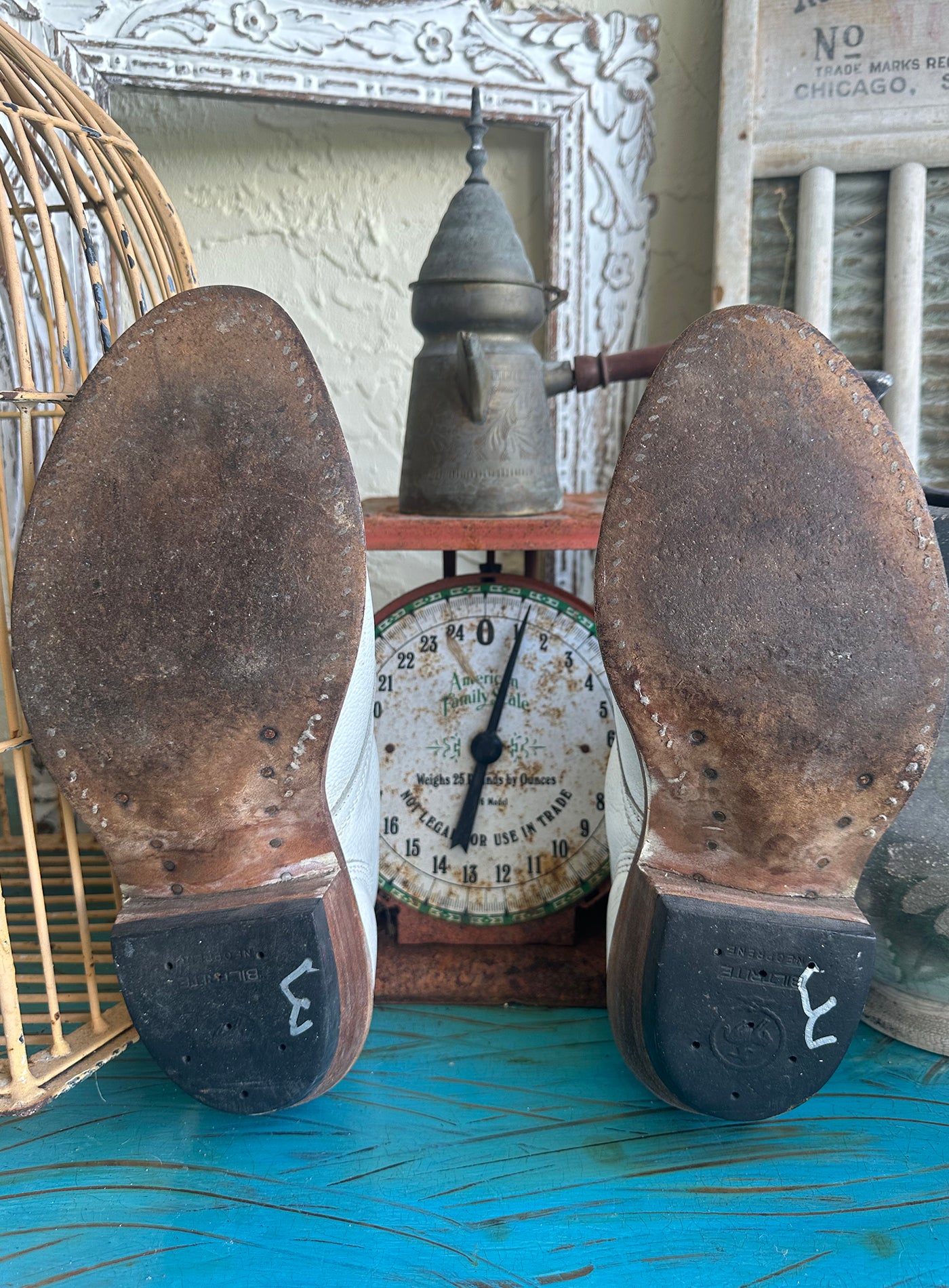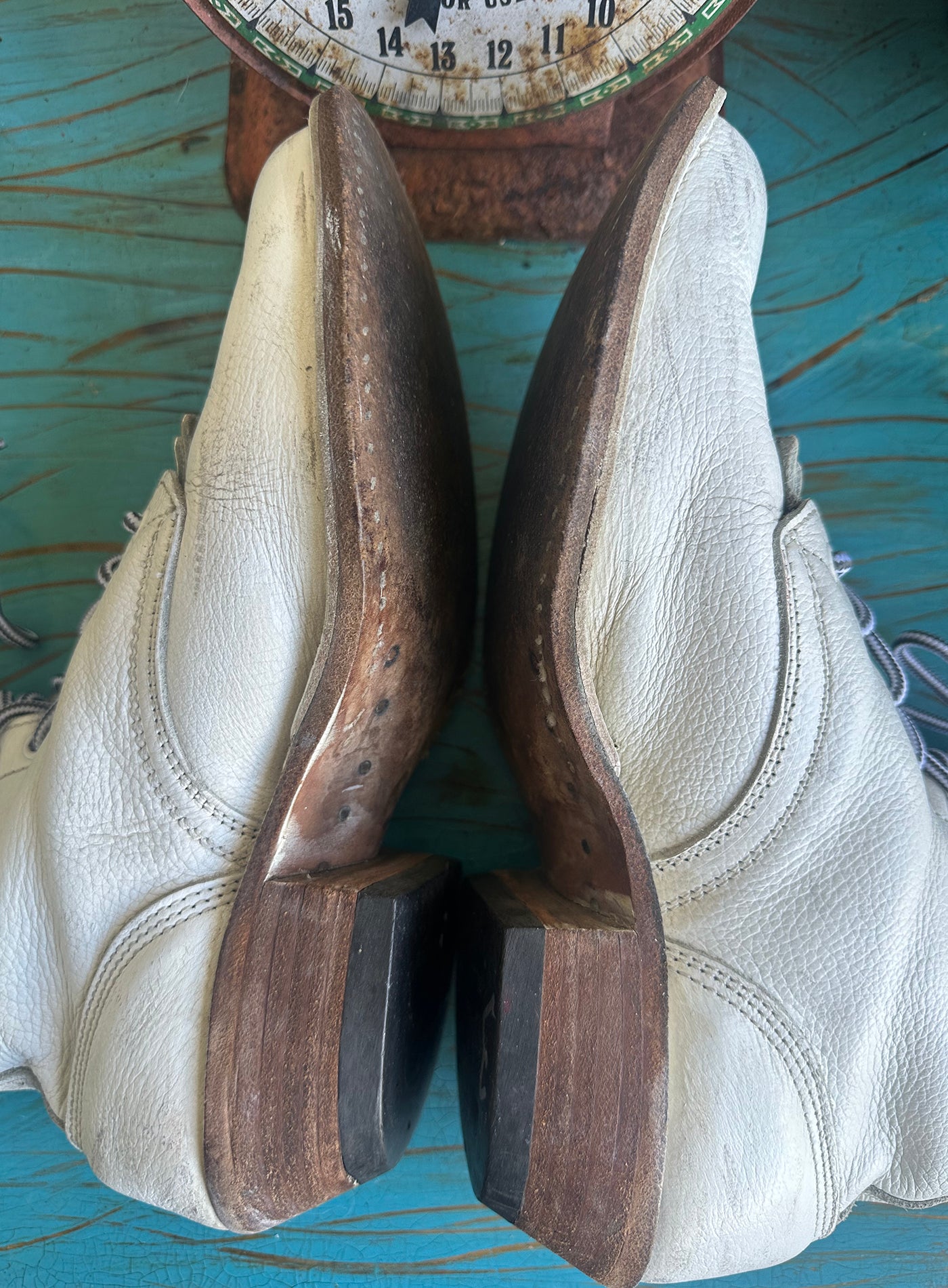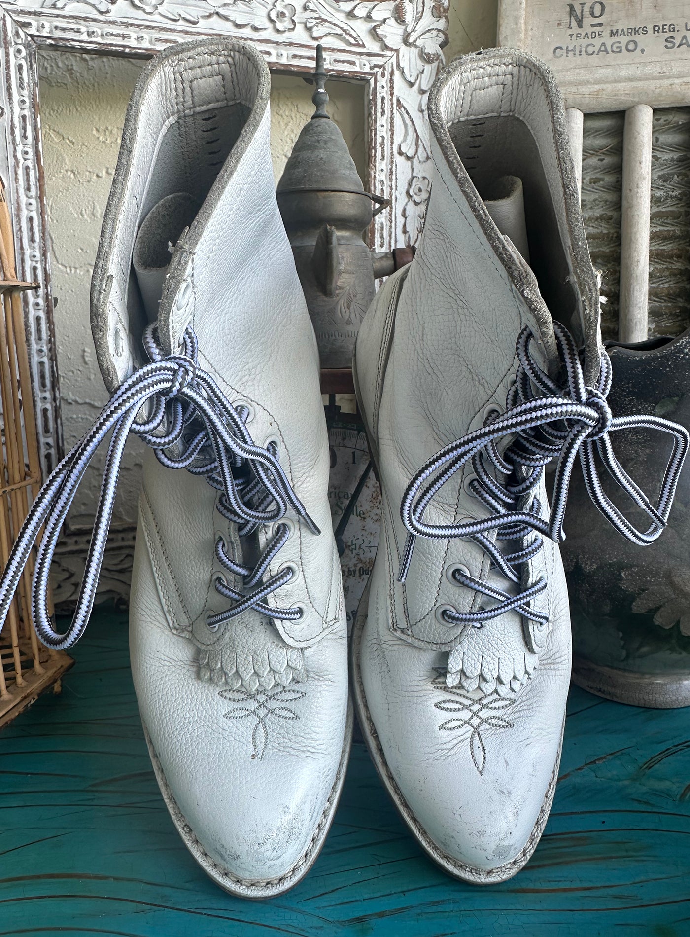 Rare Vintage 70s White Wide Lace Up Logger Kiltie Boots Extra Wide. Super soft leather. Perfectly distressed and worn in for super comfort! Would look fabulous with a pair of jeans, shorts or with a flowy western skirt. I wish they fit me! They are extra wide so PLEASE CHECK measurements to assure a proper fit. Compare the dimensions to your own boots and your feet. The Person I bought from said they were and 8 but they are bigger. I wear an 8 and they have an extra inch at least in the toe area. I had to write a size so I wrote 9F but please compare to yoru own boots!