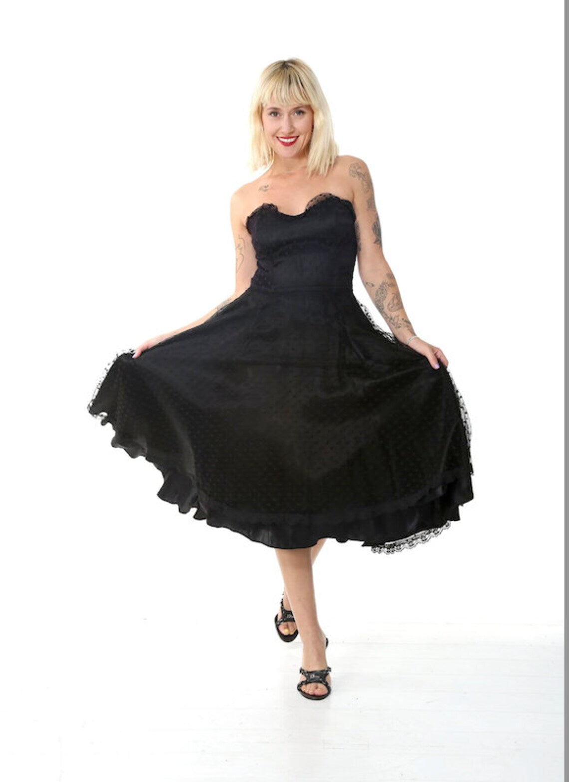 Vintage 80s Black Strapless Gunne Sax Dress by Jessica McLintock. Sweetheart Neckline. Corseted Bodice has soft bones. Zips up the back, opening into a beautiful skirt. Fully lined with Black Satiny Fabric, with Overlay of dotted Lace, and Satin Sash. Perfect for a dressey event, or hippie it up with a pair of Grunge boots. Such a great find. One you will want to wear again and again. Dress was a bit small on Lily, but the zipper closes perfectly.