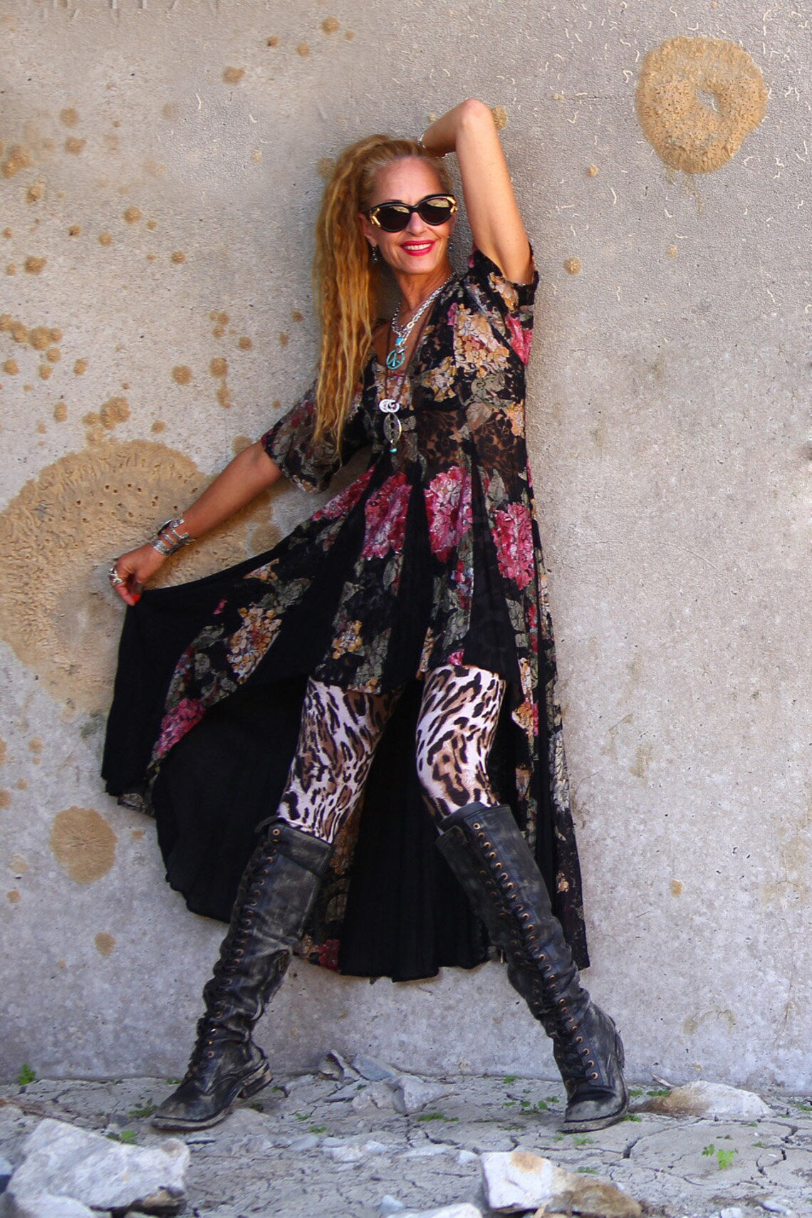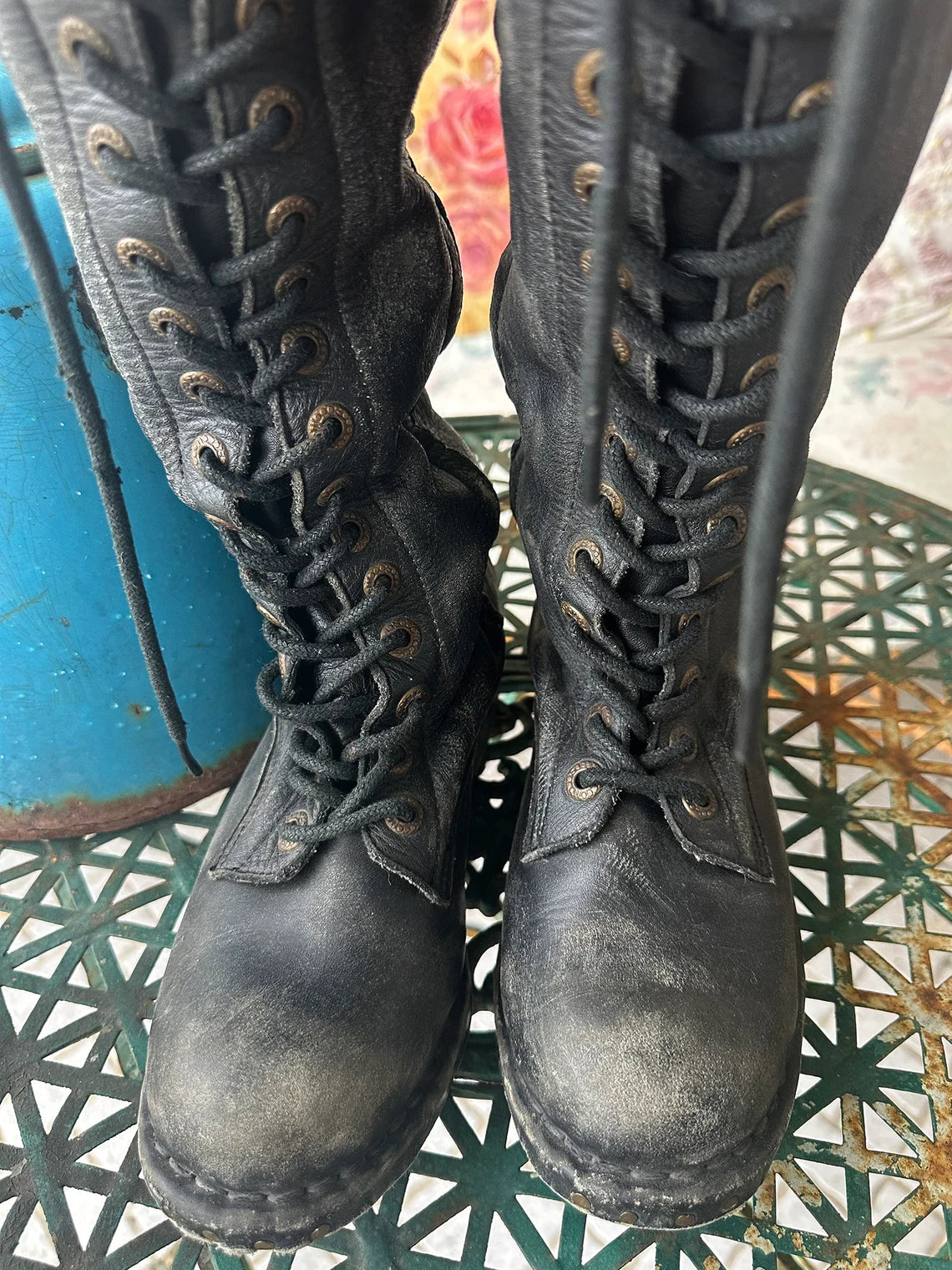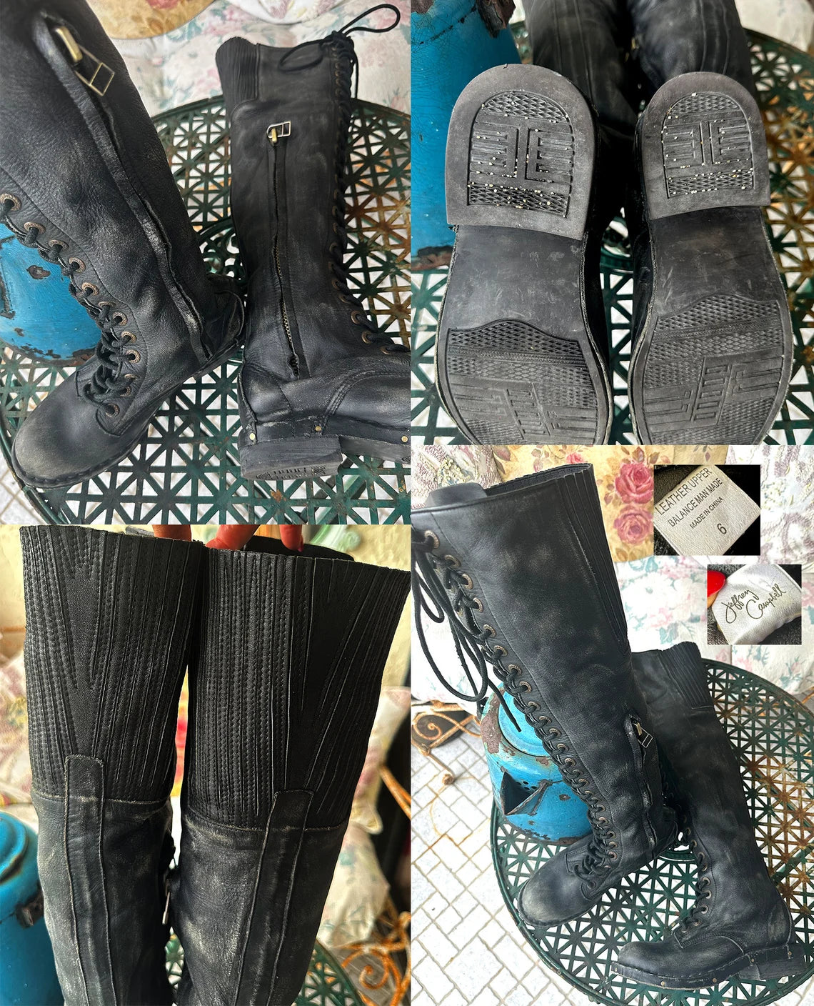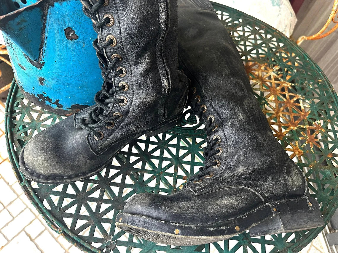 Rare Vintage Black Leather Jeffrey Campbell Tie Up Over The Knee Boots. These were my favs forever, until I wore them so much I absolutely demolished them. I bought a pair for my daughter at the same time, but she never wore them. Many of the photos are of the ones I wore to death and shots of models when I used the boots to show my vintage dresses, but there are several photos of the new unworn(except when worn for the photos you see here.) They are made of very comfortable, soft leather, and look amazing with everything, skirts, dresses. Jeans, shorts ..you name it. They are definitely a statement, but they are incredible! Wish these fit me, but they don't so now you can have a go at them. You won't regret it! They are the best and they are not made anymore! Wish they fit me..Oh I said that....