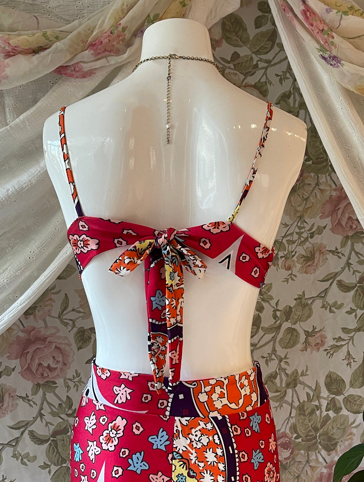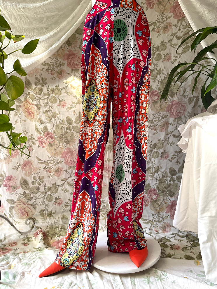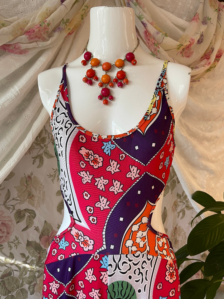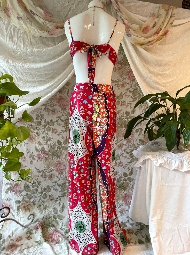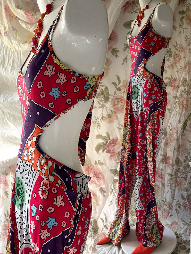 Vintage 70s Red Cut Out Tie Back Cat Suit Onesie with Bell Bottoms Pants. Fantastically fantastic piece! Great scoop neck with the sides cut out! So much fun to wear at a Costume Party, Evening on the Town or just because you want to wear something that is so comfy and fun! Great with a pair of vintage platform shoes, or boots. Amazingly bold colorful pattern. Made of rayon spandex with a bit of a sheen. Lightweight and super comfortable. Please note the size, especially around the waist area to assure a proper fit. In excellent condition and ready to rock and roll!