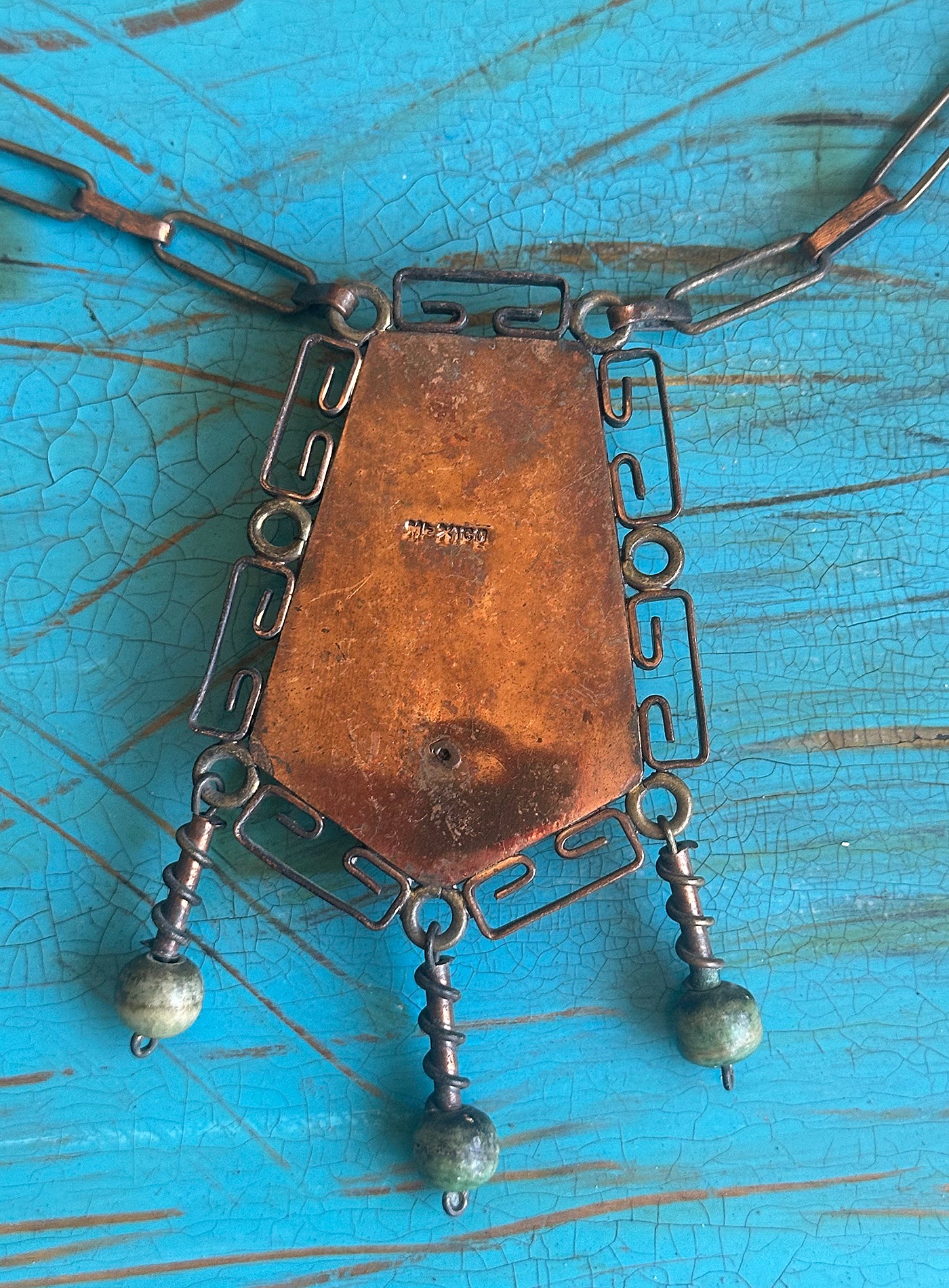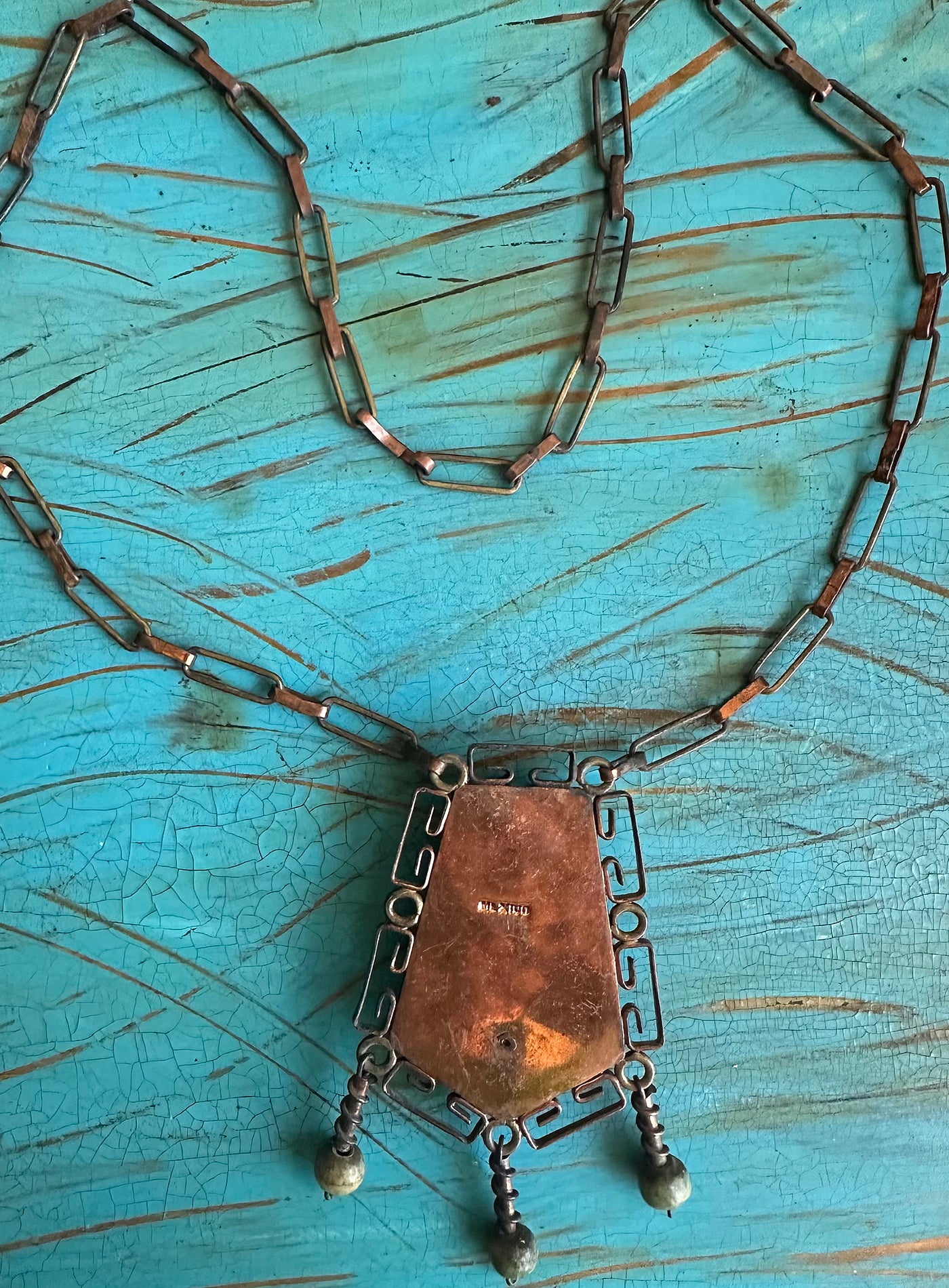 Vintage Marked Mexican Copper and Brass Long Chain Necklace with Jade like Aztec Mayan Man Pendant and Jade Beads from the 30s. Stamped Mexico. Hand Forged One Of A Kind Piece.