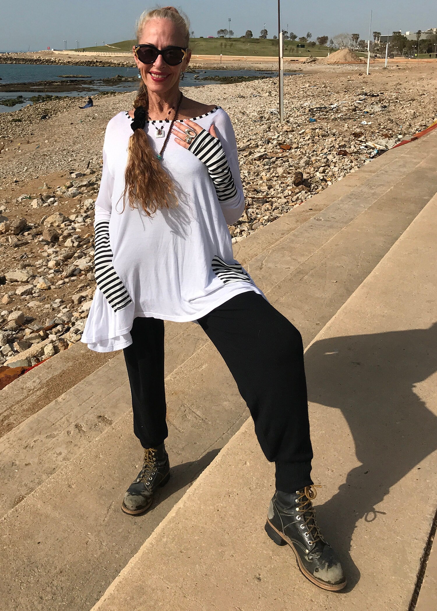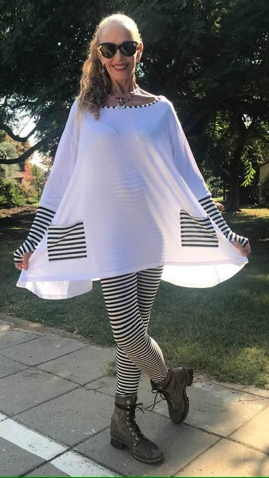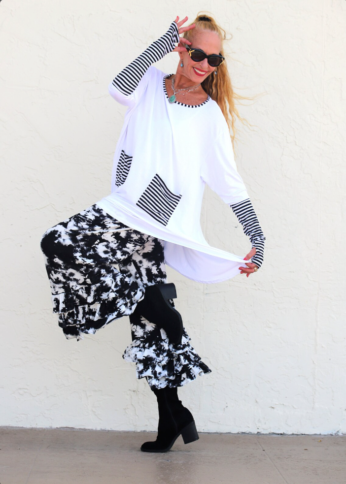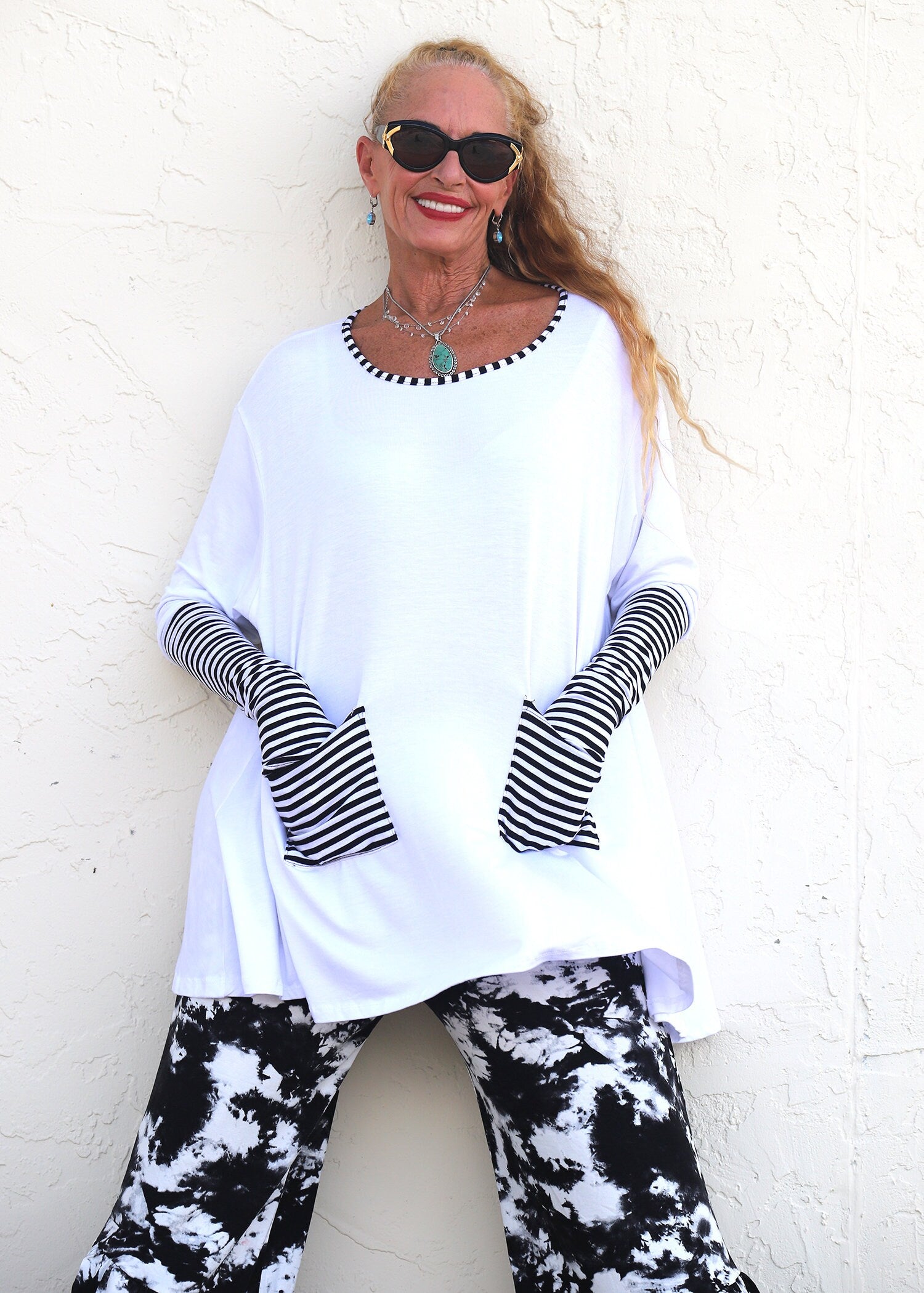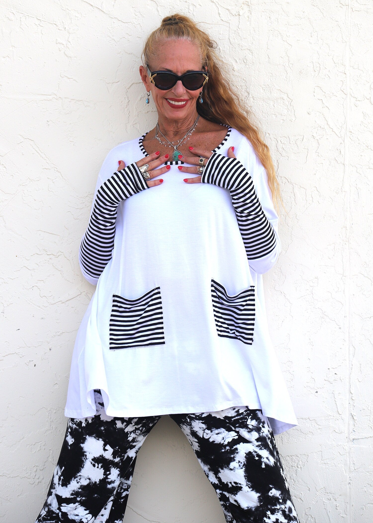 My White and Black "Stripies"" Flare Top with Striped Cuffs, Pockets with matching Striped trim around the neckline, and of course the cuffs have Thumbholes! The Back is solid white. So much fun to wear, in the Softest Rayon Spandex Material, and the fit is classic Frenchie! Just the perfect top to go with all my Black and White goodies, and you will definitely have plenty in your own closet to match with this adorably comfy top. So flattering. Covers you in all the right places, and the wide bottom gives the top beautiful movement and coverage. Comes in One Size that is sure to fit so many women! I show it here with my Susie Stripe PantalOOnie's and my Splotchy Black and White PantalOOnie's, but fab with a pair of white or black jeans, or skirts.