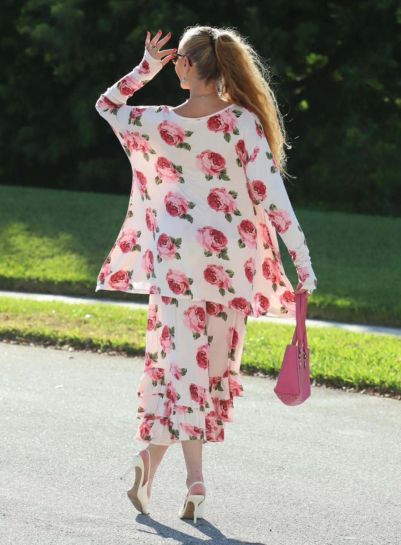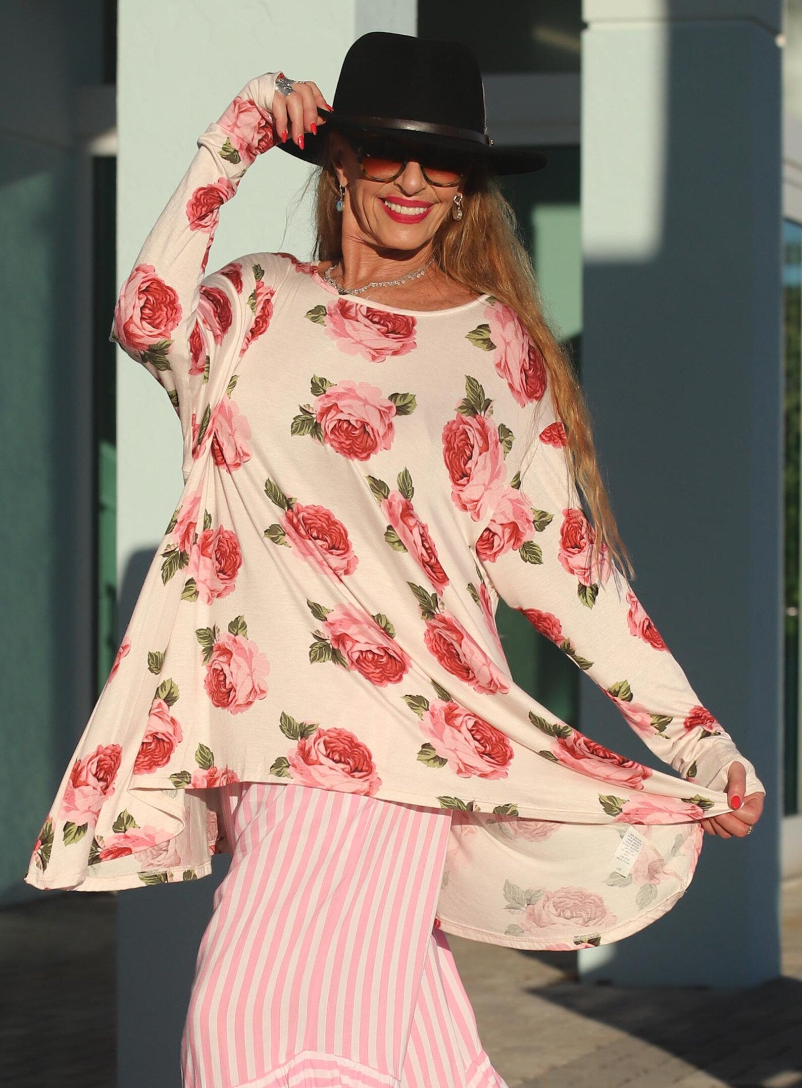 Willa Rose White and Pink Floral Flare Thumbhole Long Sleeve Frenchie Top in the softest, yummiest Rayon Spandex. So flattering to all body types in the most beautiful Rose Floral Print. I was so excited to find this material and print and know that you will find so many ways to wear it. Lots of stretch to this delicious top.
